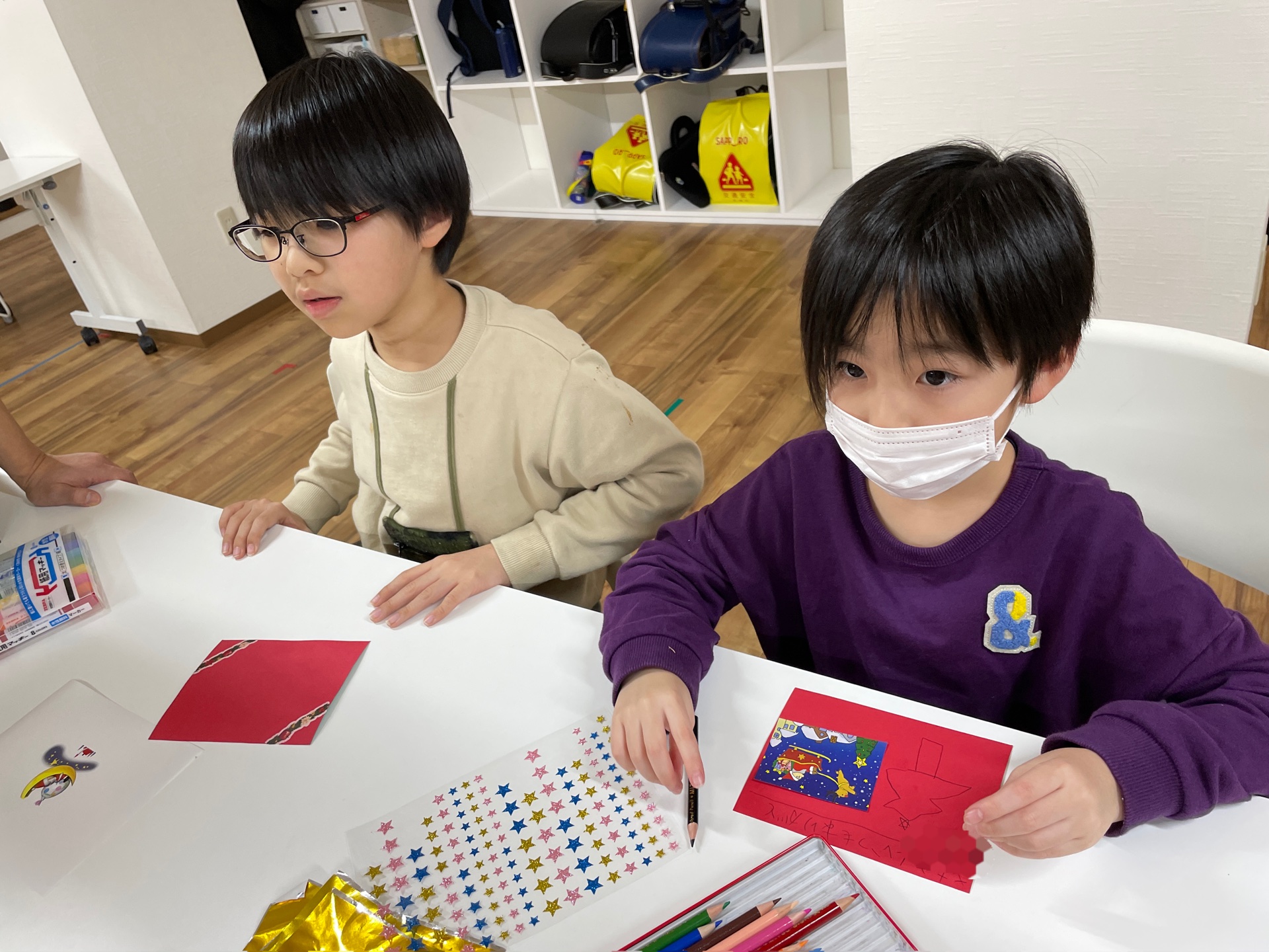 色々な素材を使ったり、絵や文字を描いてクリスマス会で使うカードを作っていきます。