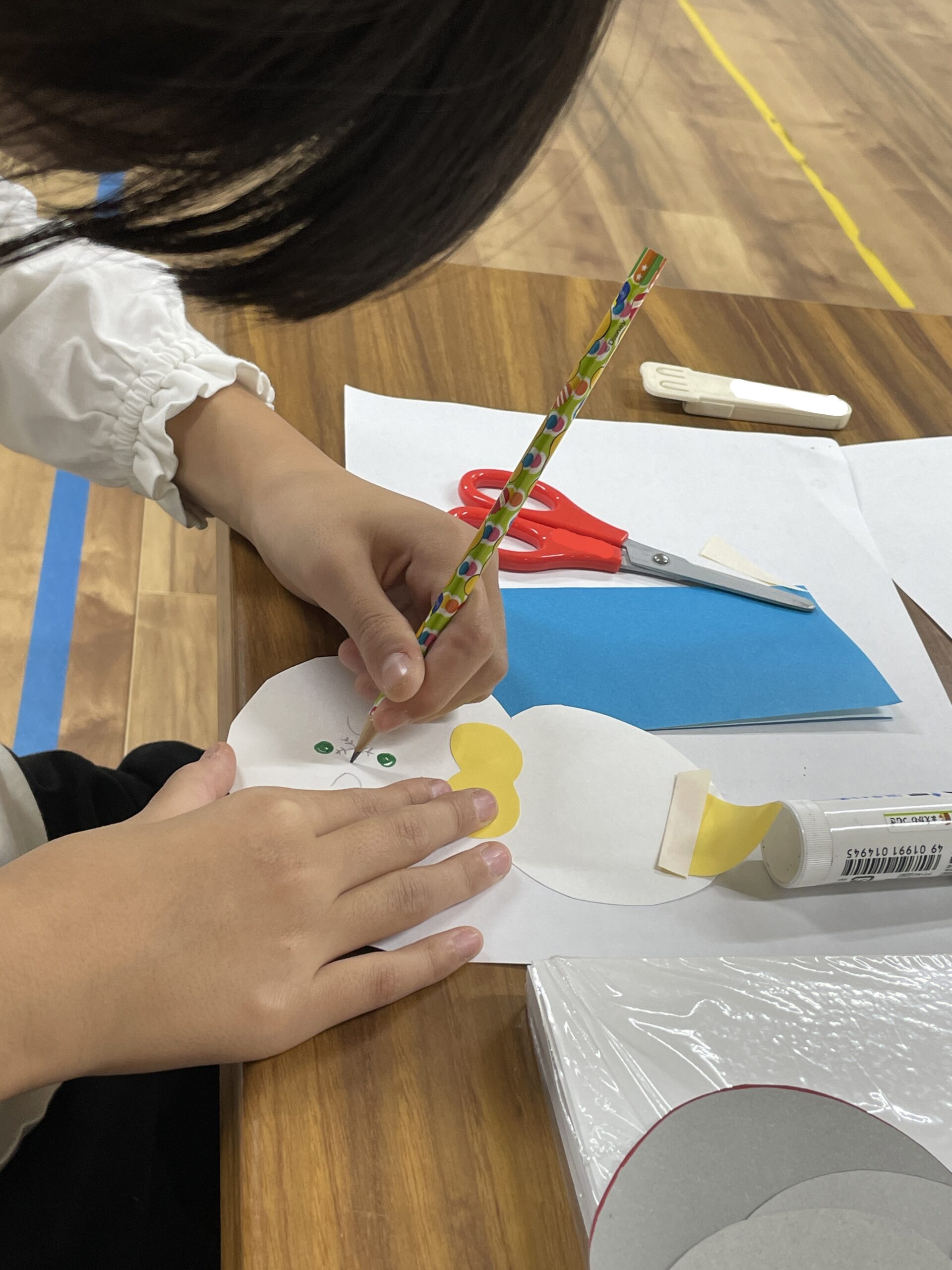 女子たちは雪だるまをかたどった画用紙にクリスマス柄の紙でマフラーや帽子を着けていきます。