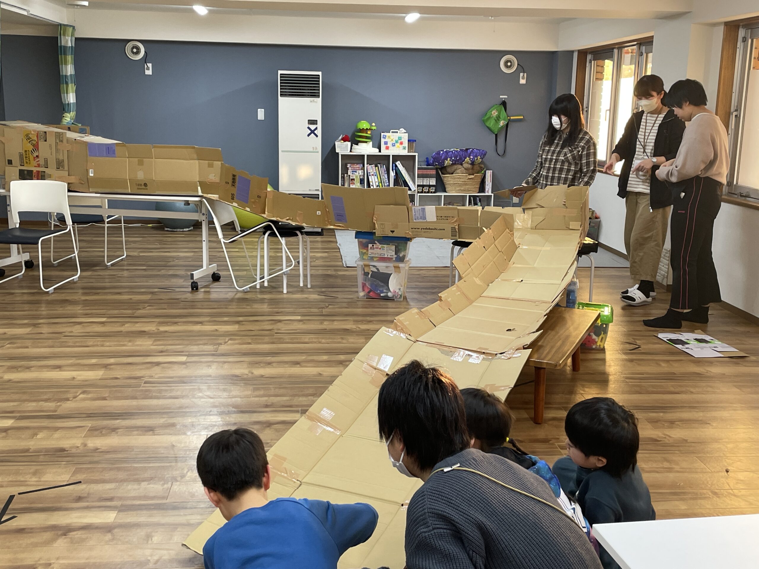 段ボールで巨大な滑り台を作って、ボールを転がしまくりました。
