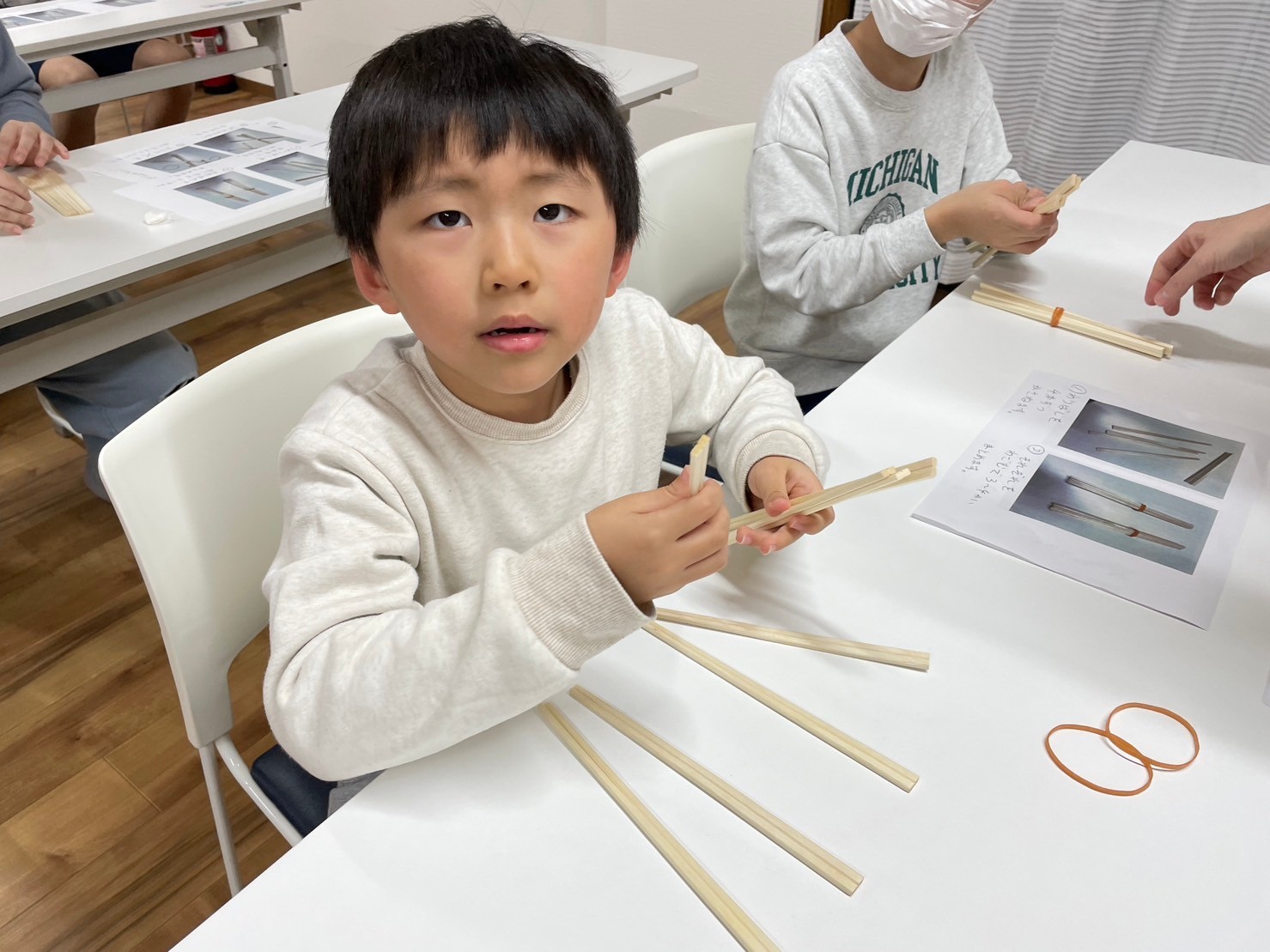 水曜日は引き続き「製作」をテーマに、この日は割りばしと輪ゴムを使って『マジックハンド』を作りました。