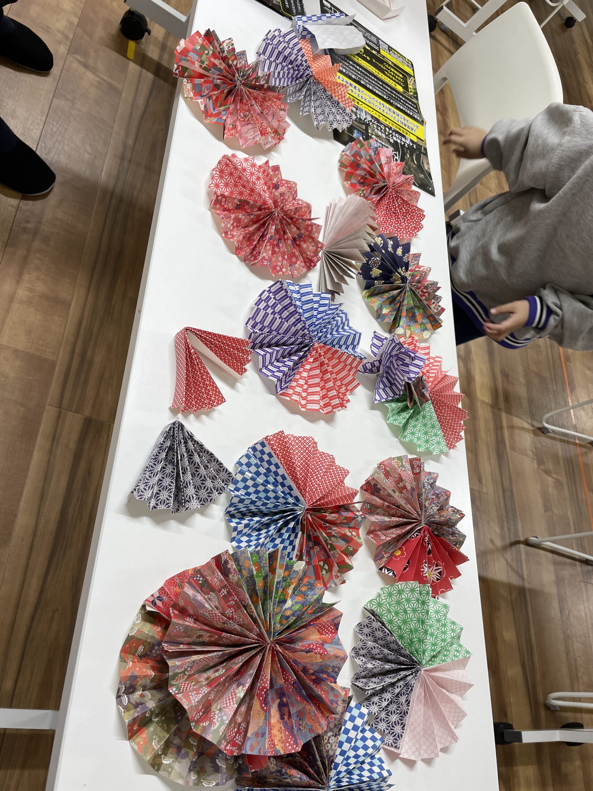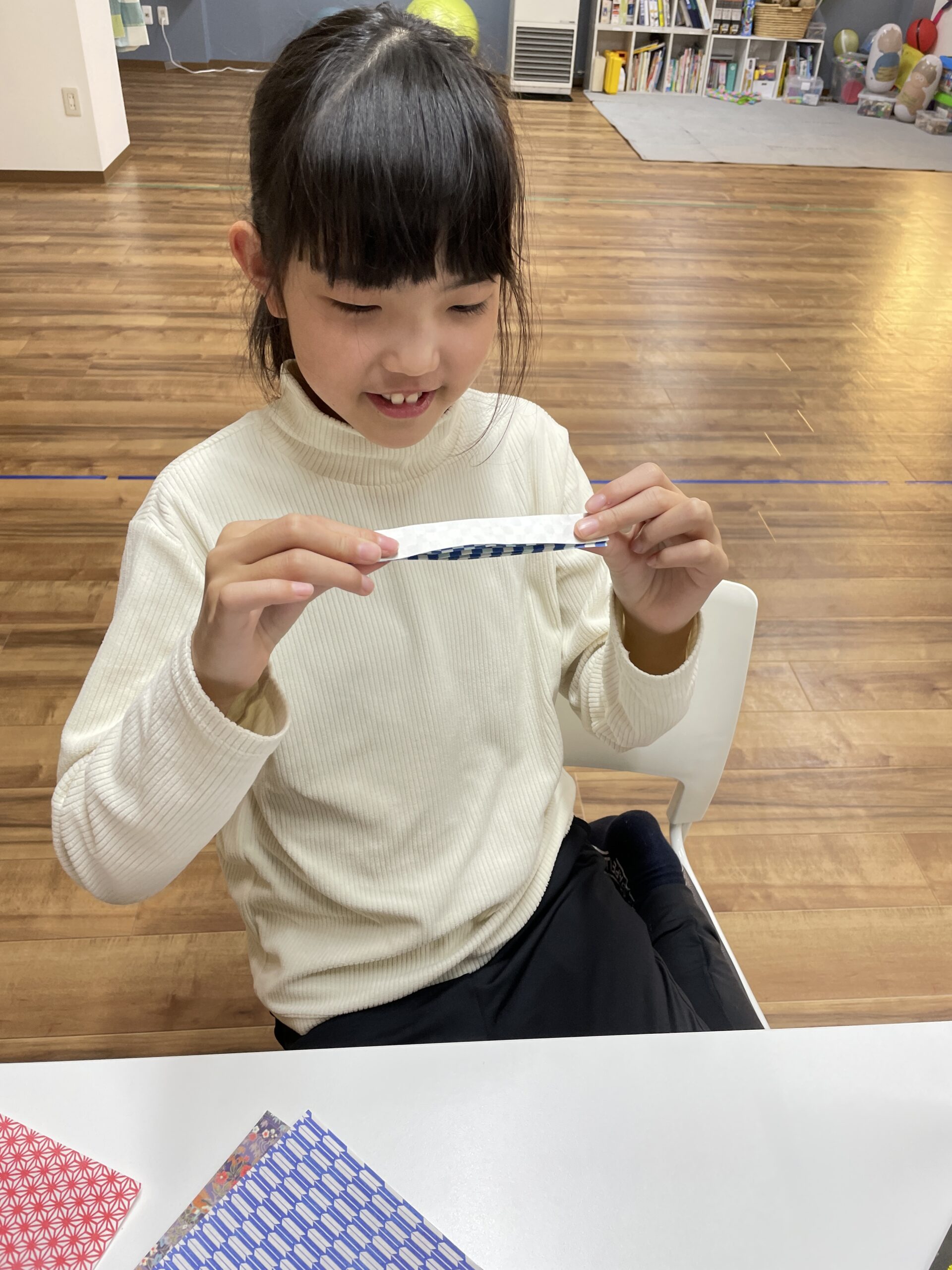 いつもの無地の折り紙とは違って、にぎやか柄が入った折り紙ではテンションも変わってきますね。