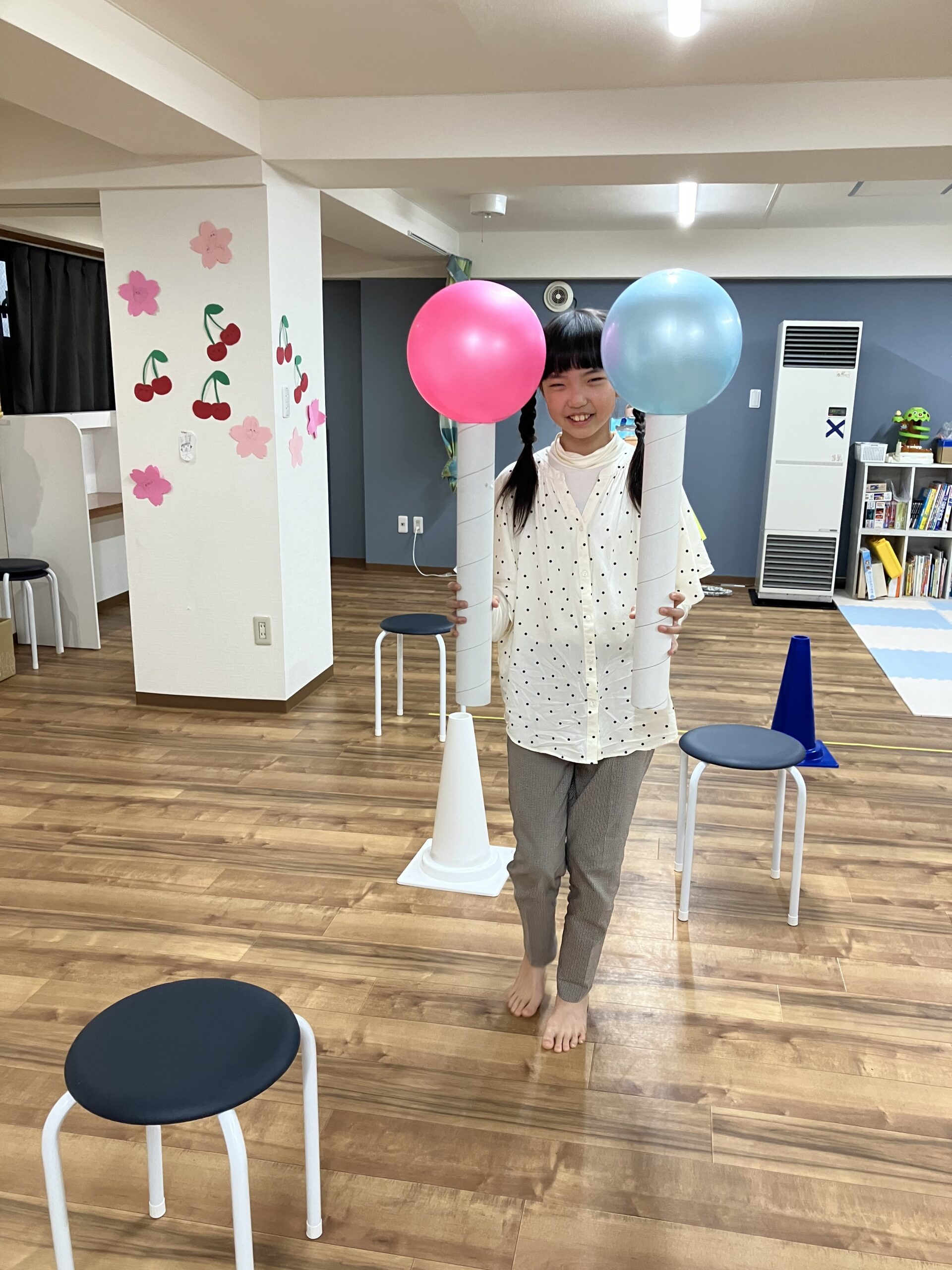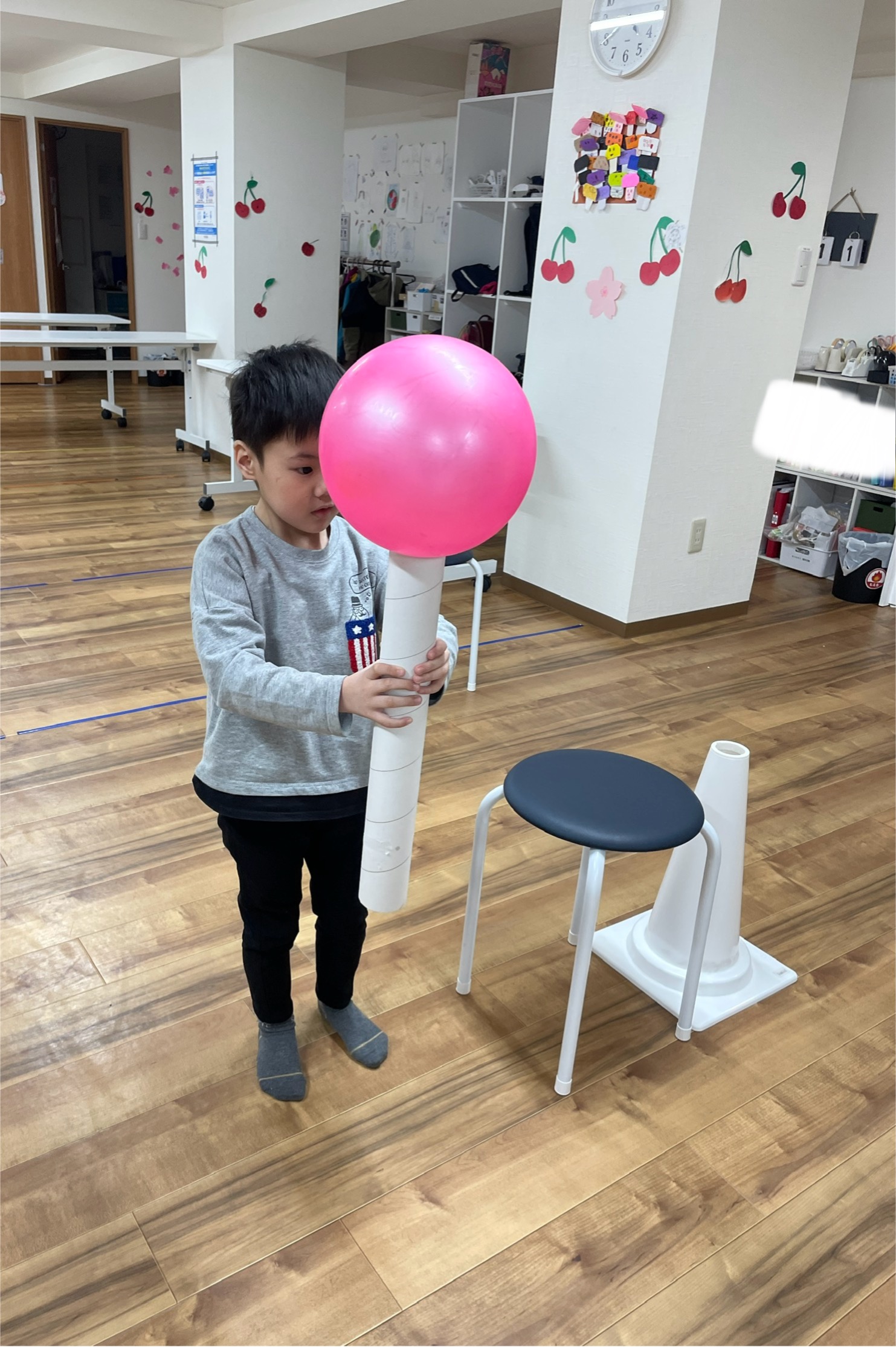今回は大きい筒の上にボールを乗せて、落とさないように歩きます。