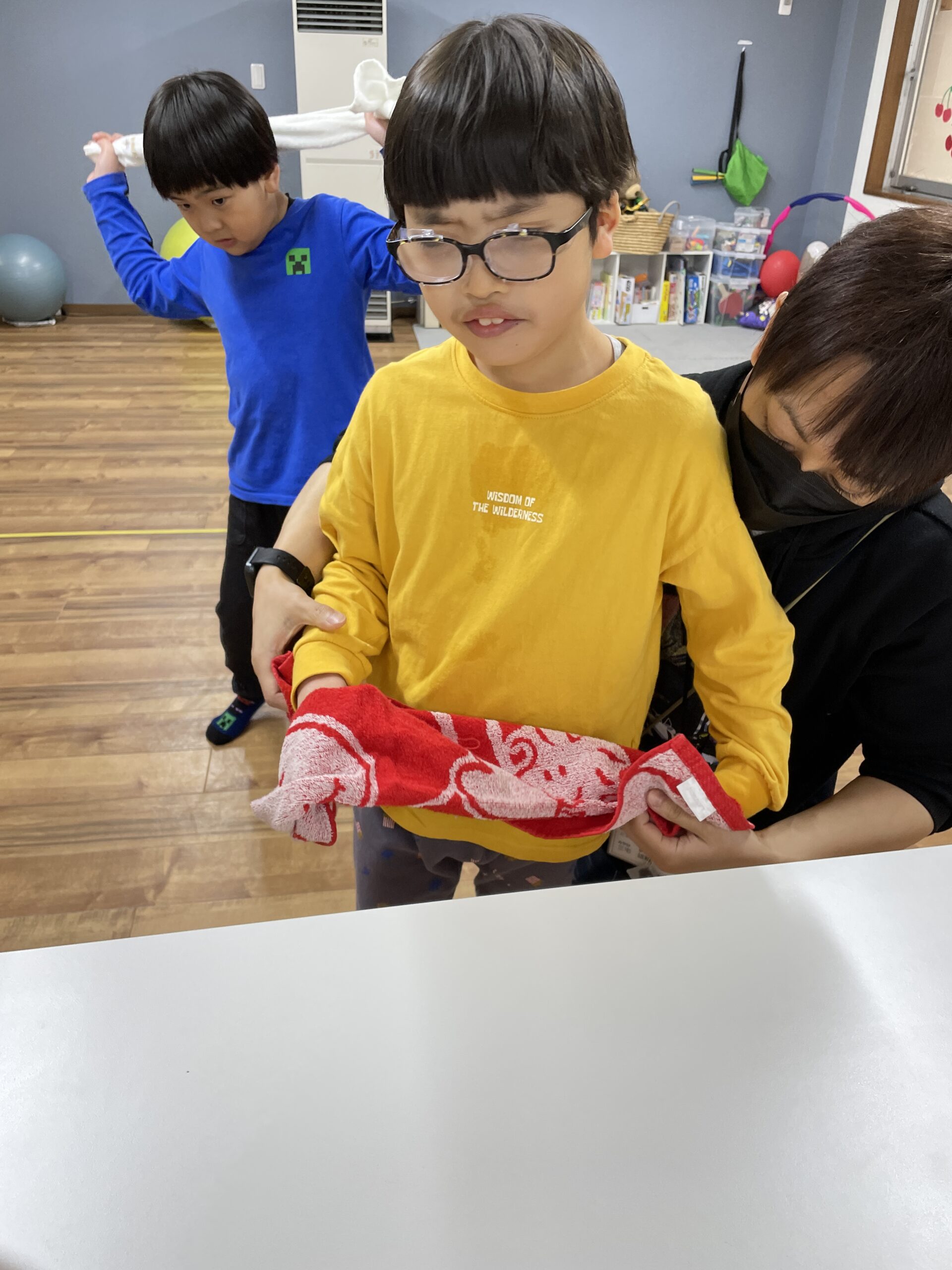 タオルを使っての体操やタオルを投げて運動機能を高めたり、