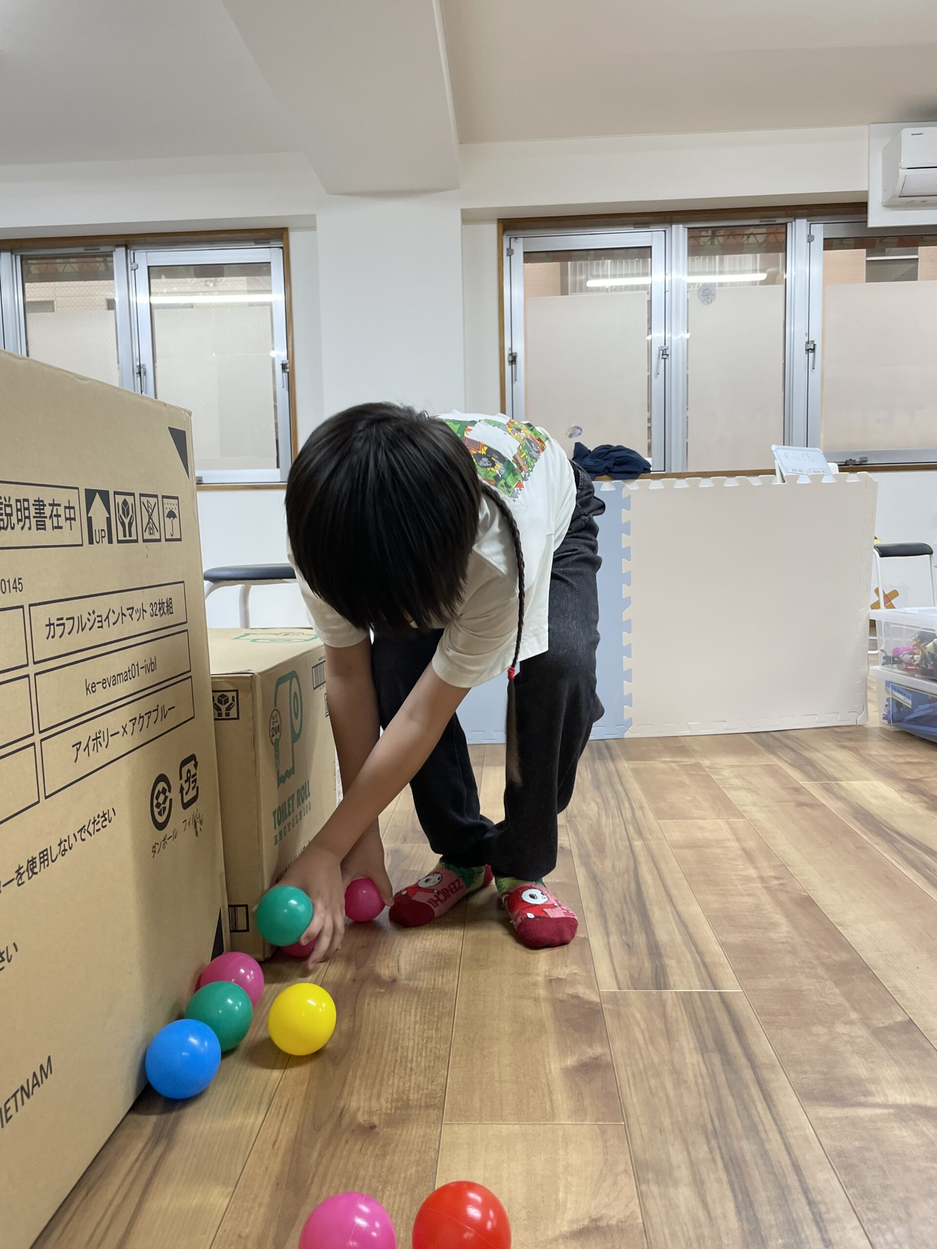 ティッシュの箱を積み上げたり、洗濯バサミでペットボトルキャップを掴んだりして手先とバランス感覚をテーマとした活動をした子