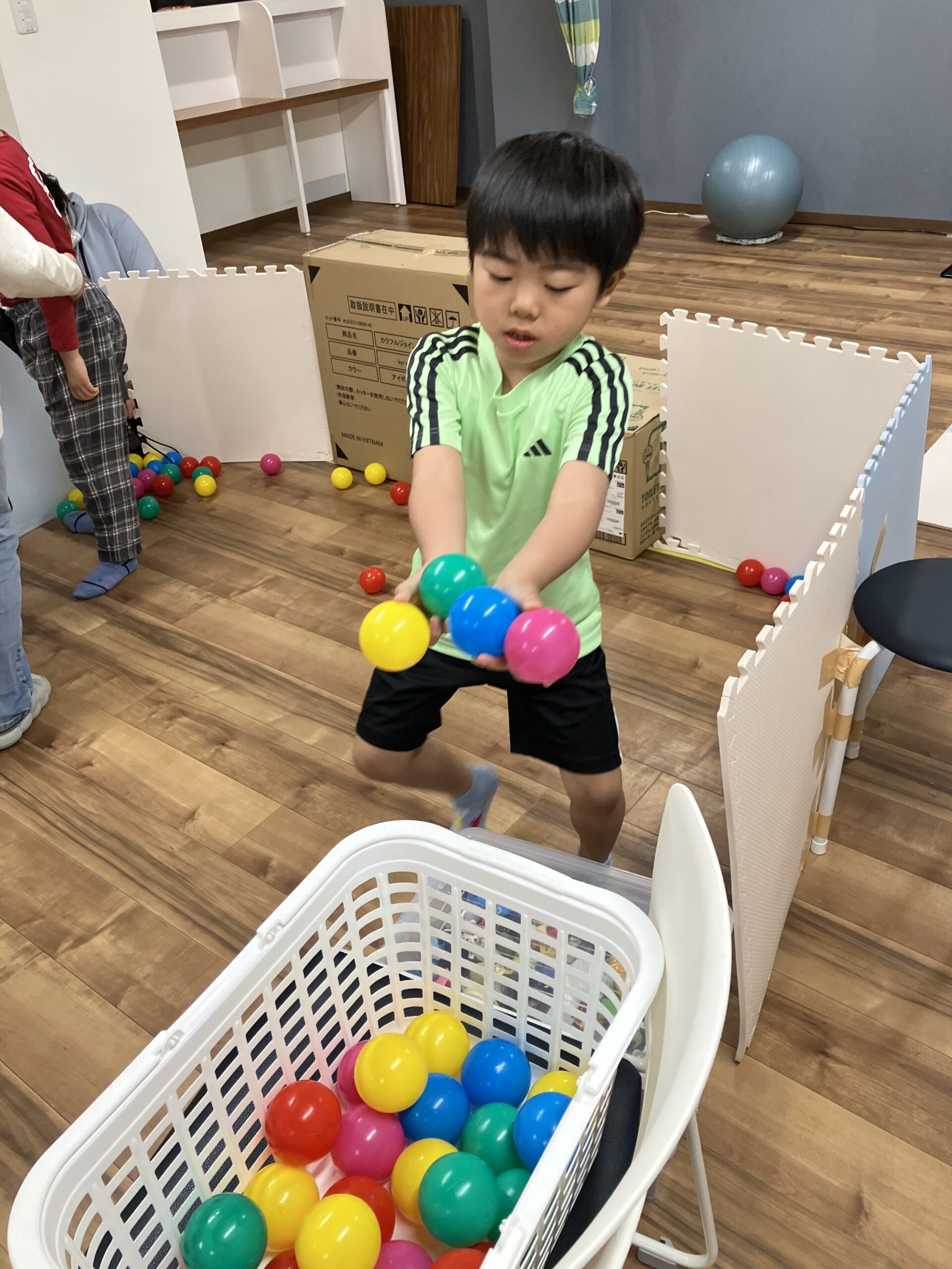とてもたくさんの散らかったカラーボールを二人一組のペアになって、片付けるゲームです。