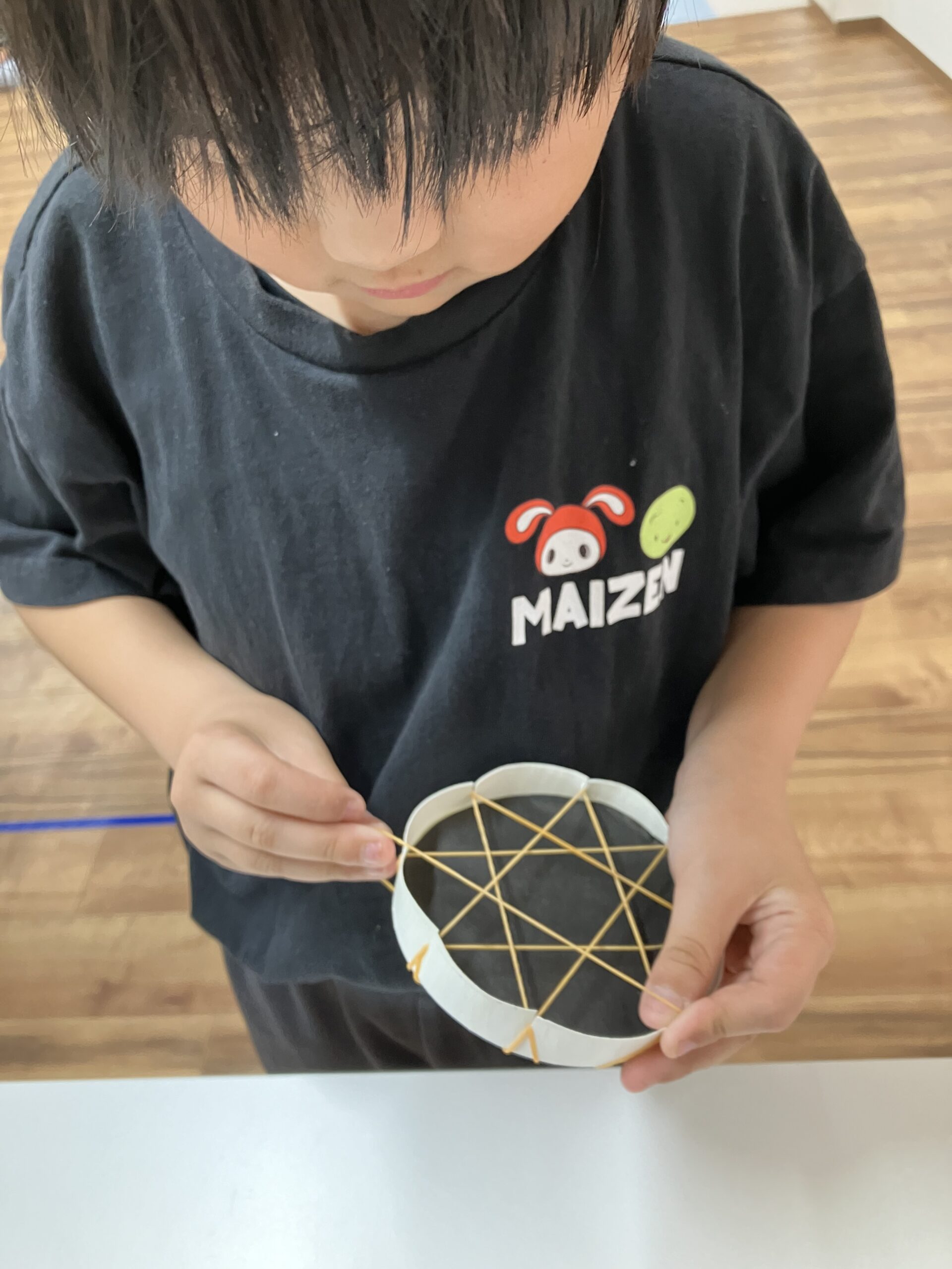 この日は、ストローを使ってペグ差しや、輪ゴムを切れ目にひっかける微細運動をやった子