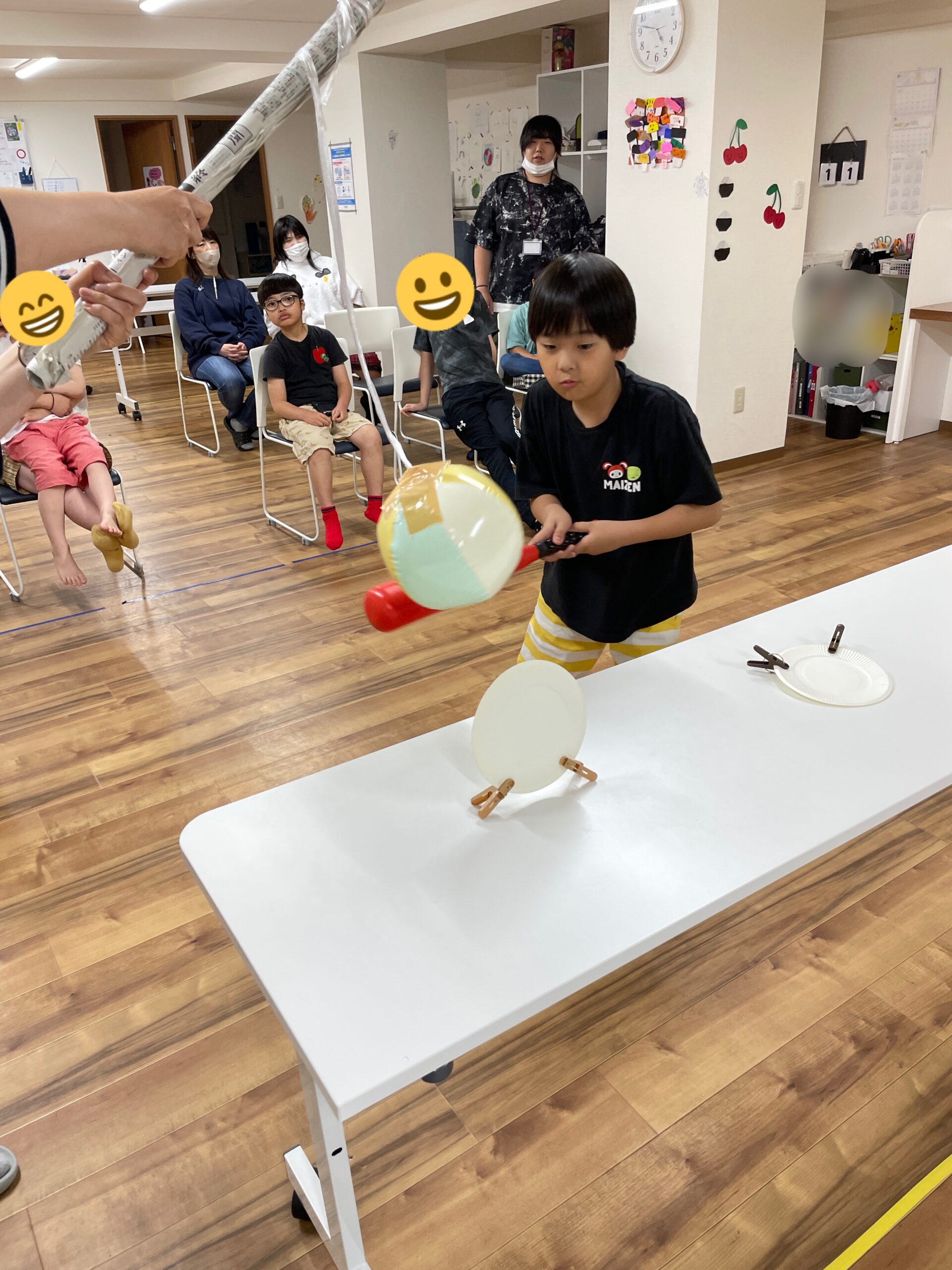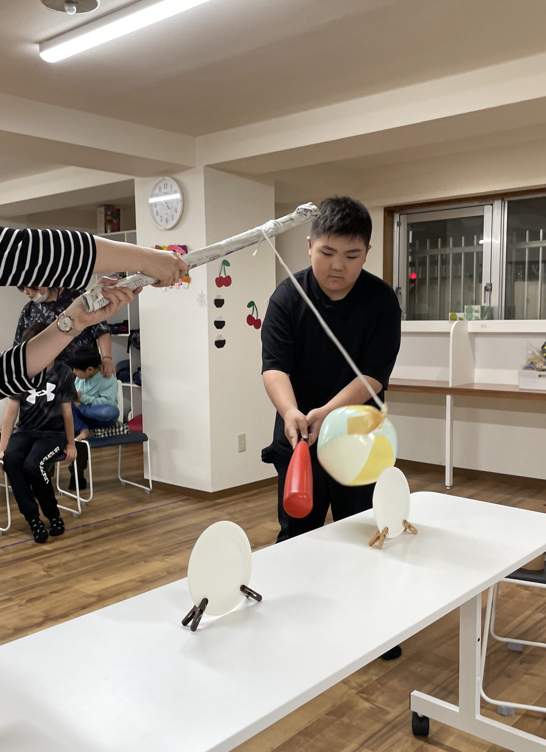 次に、棒の先に吊るしてある柔らかいボールを、テーブルの上には立たせた紙皿の的めがけて、バットで打っていきます。
