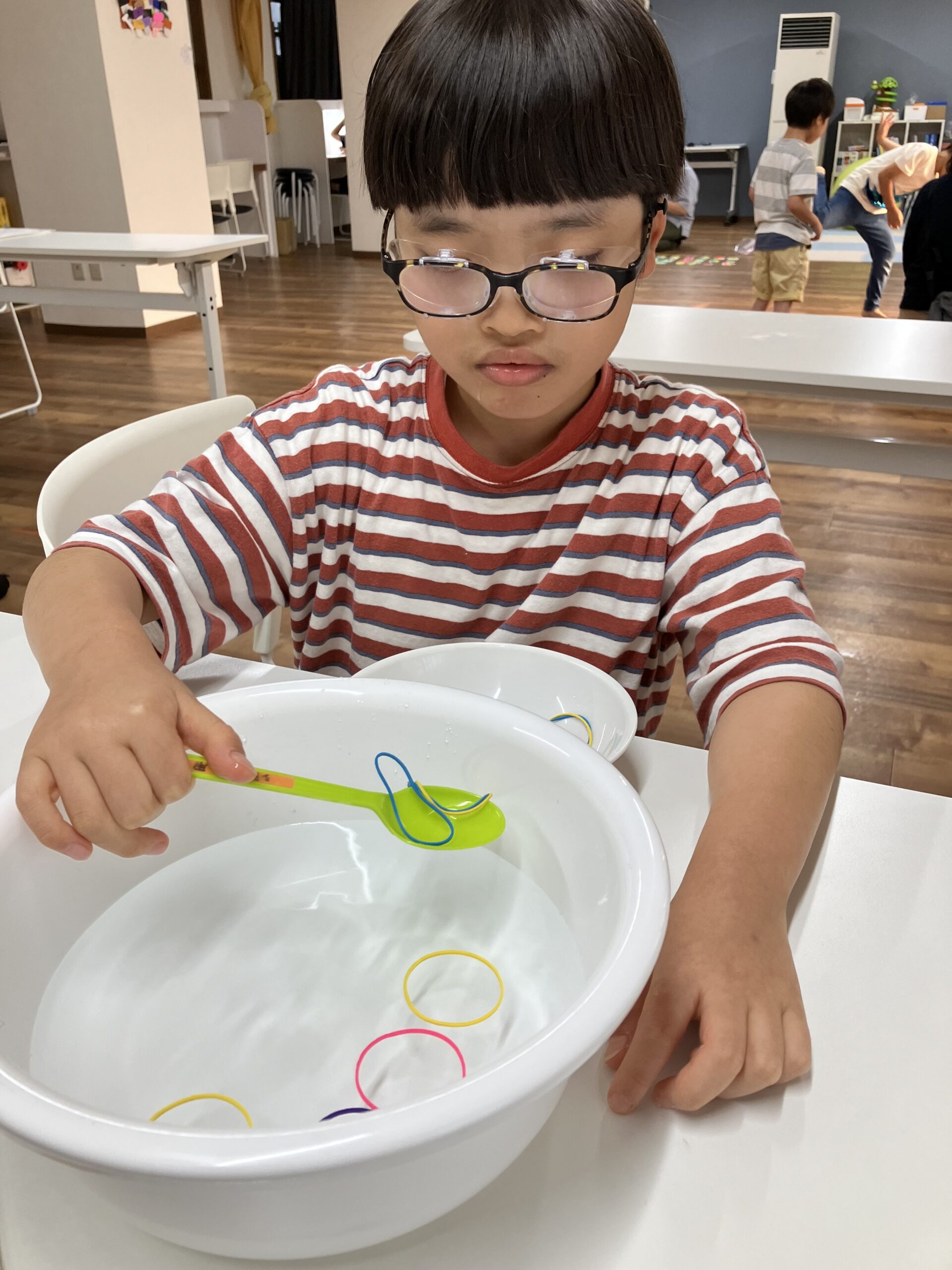 水に浮かんだ輪ゴムを箸やスプーンでひっかけてとる輪ゴム釣りをして手先だけではなく見る力をつける活動をした子