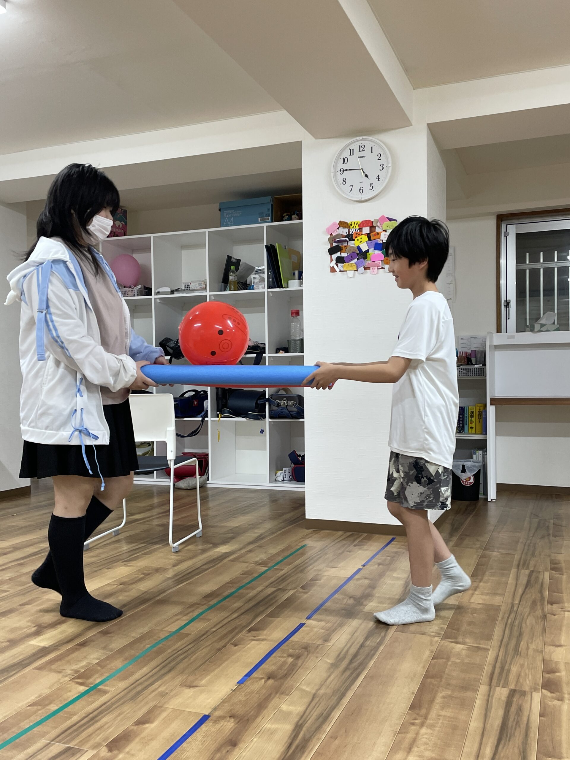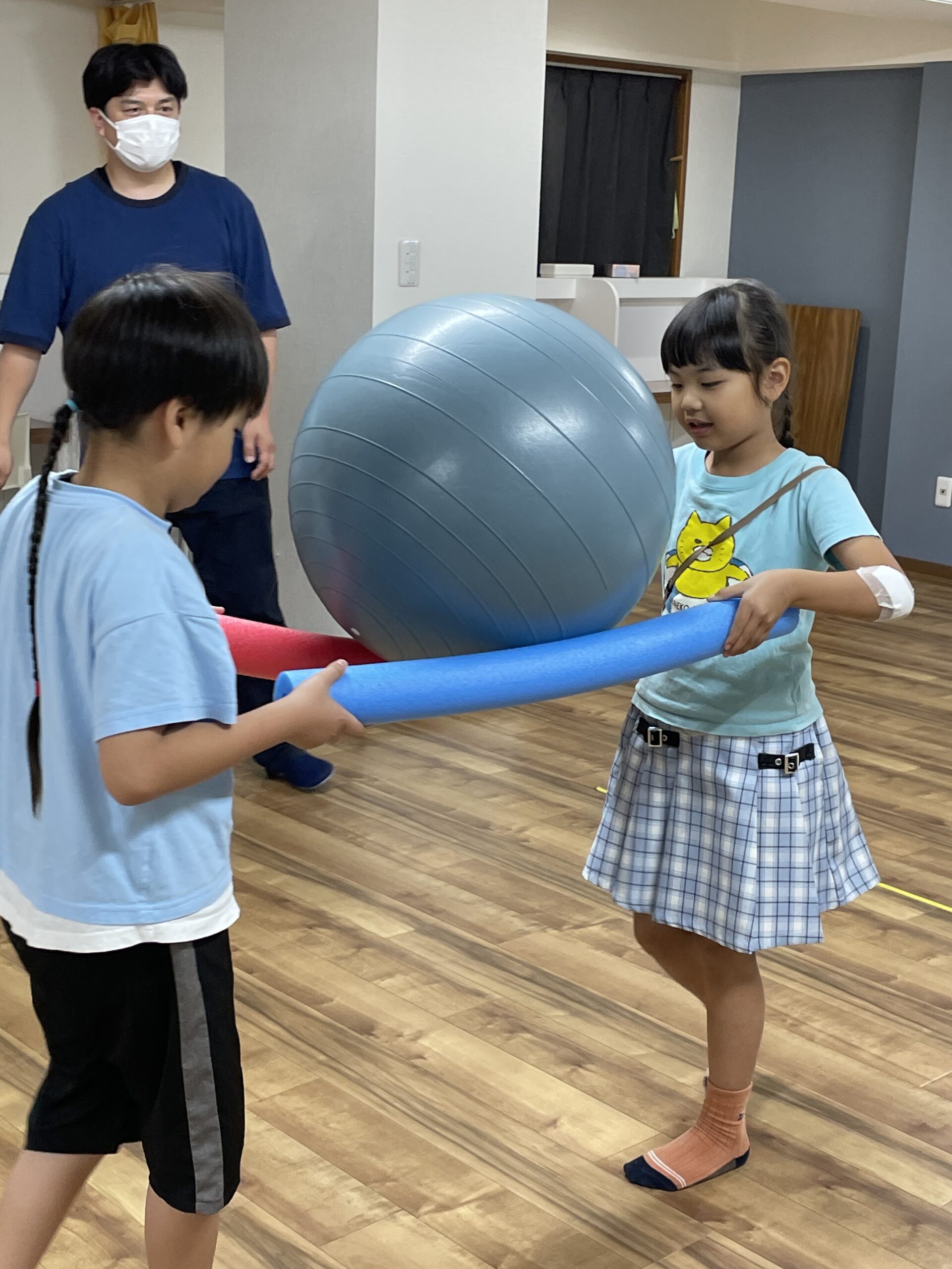 二人一組でプールスティックを持ち、その上にアイテムを乗せて落とさないように気を付けて運びます。