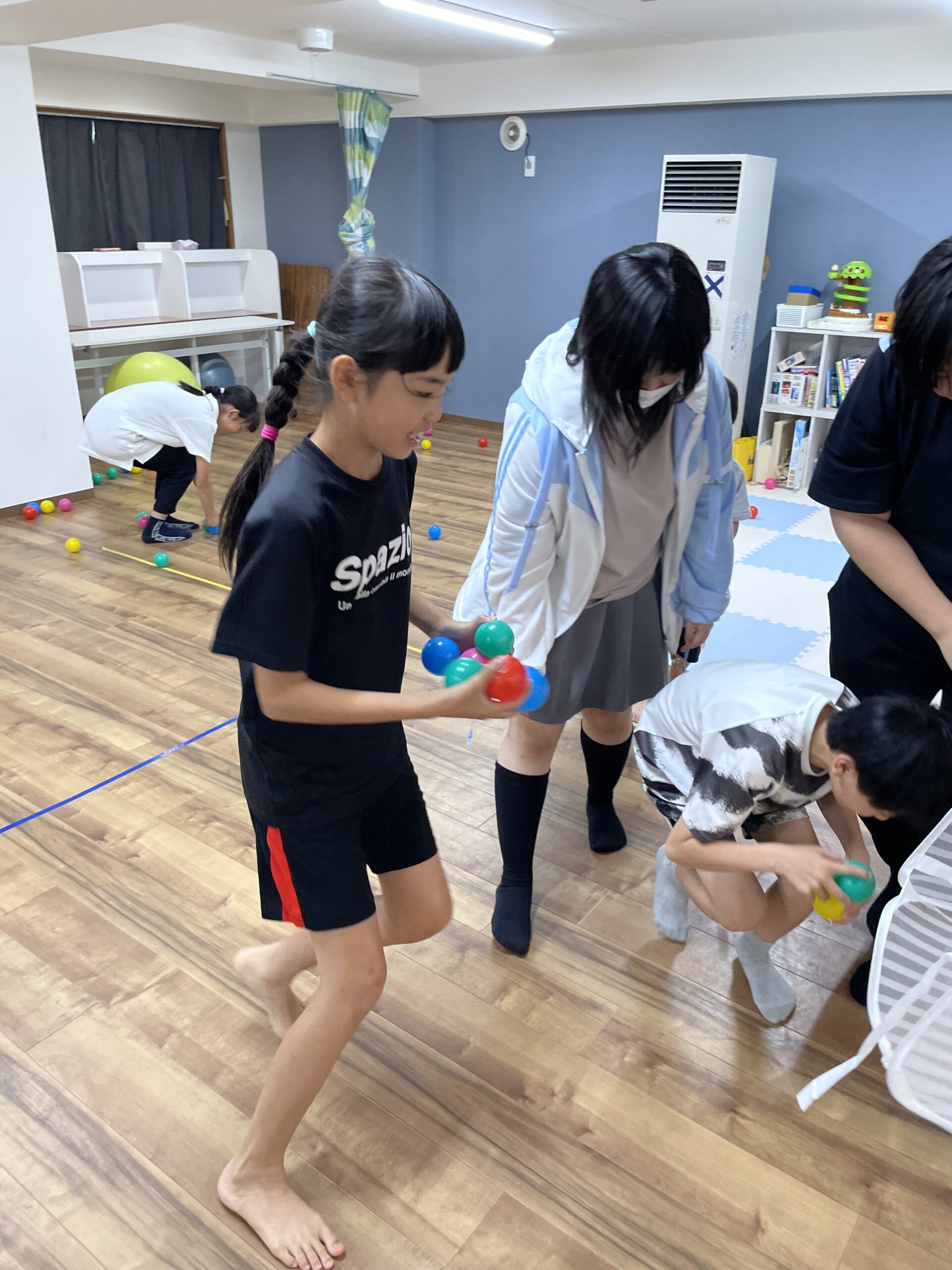 2チームに分かれて、制限時間30秒で動くカゴにカラーボールを入れていきます。(勝ち負けなし)
