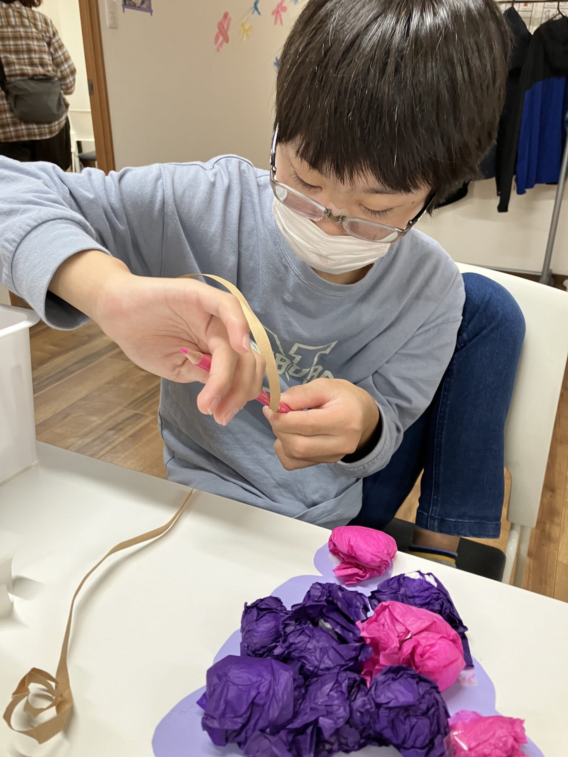 ツルの部分になる画用紙は、鉛筆を巻き付けてから解き、ウエーブ状にしましたよ!