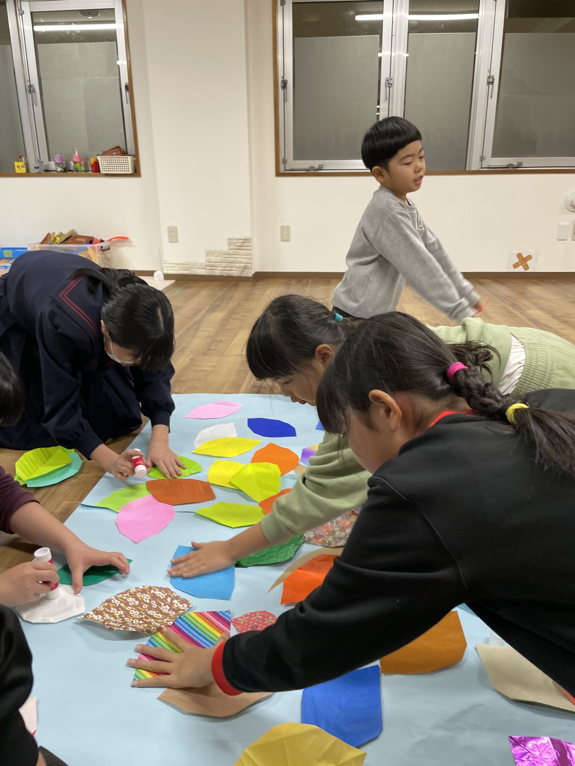 色の指定は特に決めなかったので、個性豊かなカラフルな落ち葉壁面が完成しました^^