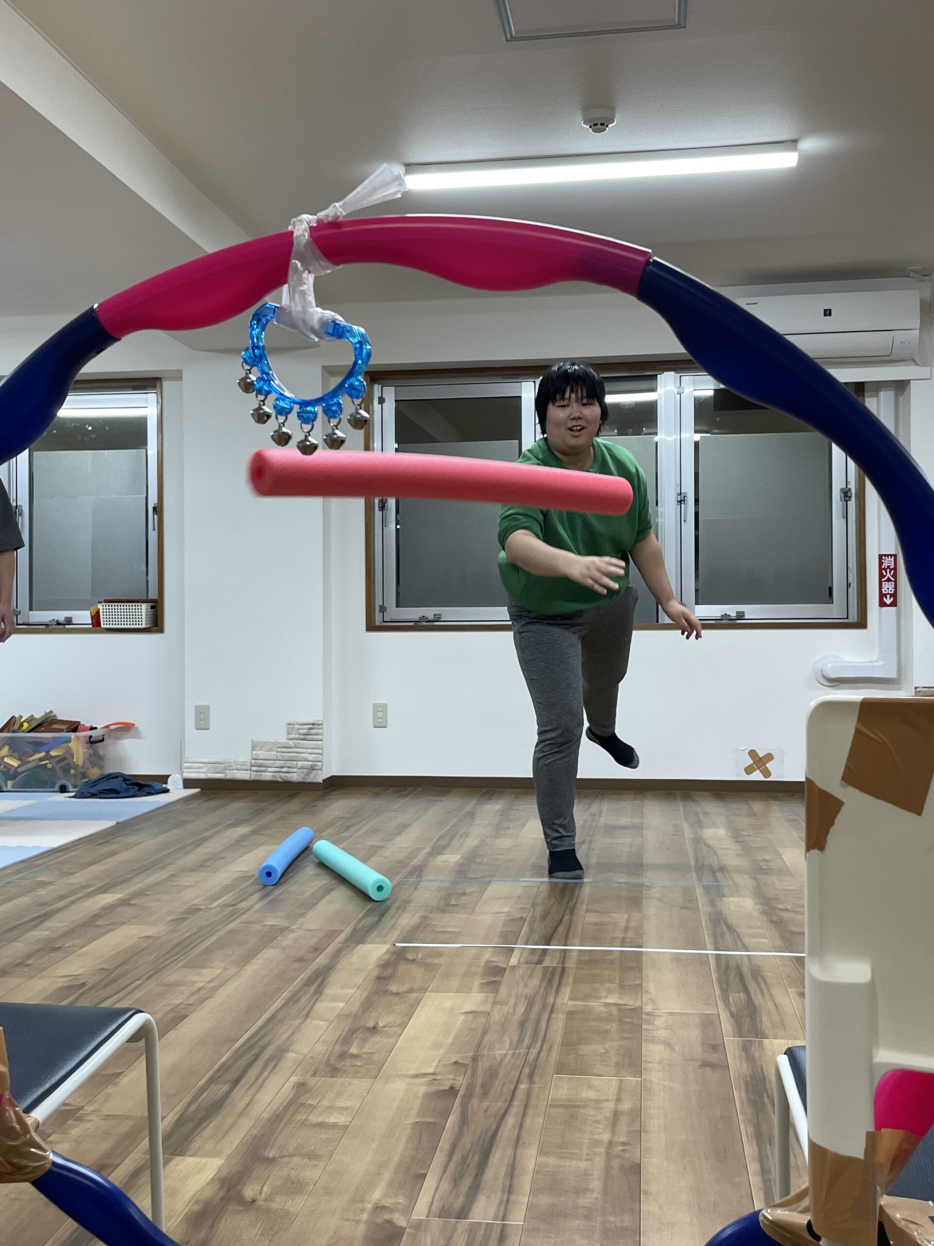 プールスティックを投げ飛ばして輪の中に投げ入れる、それだけです。