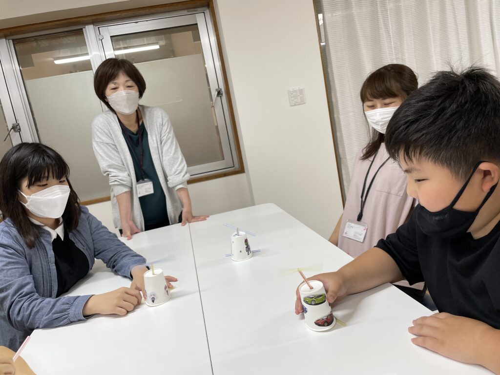 紙コップに輪ゴムでストローをつけ、くるくると回し、