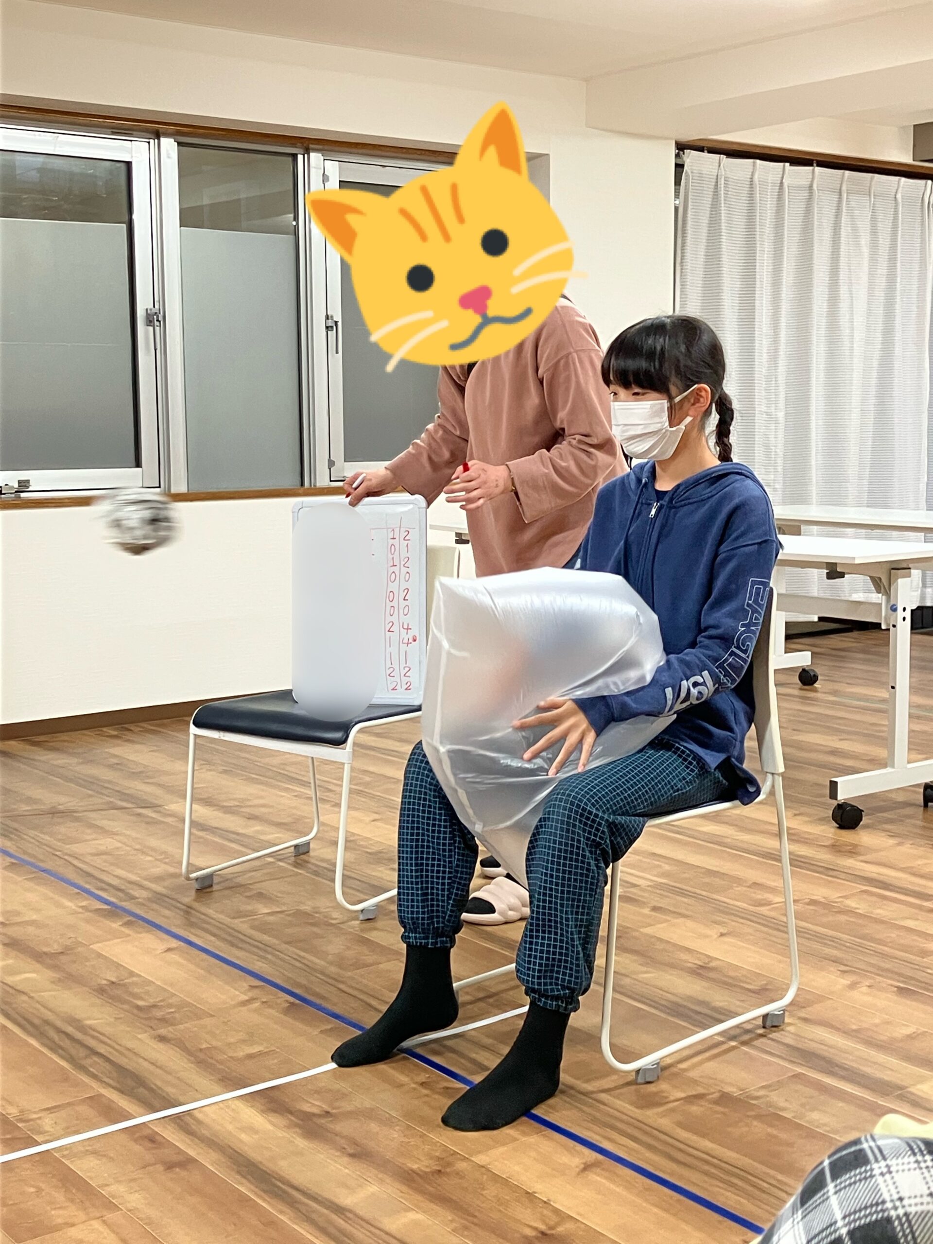 目を使った運動として、風船バレーをしたのですが、いつもの風船バレーとはちょっと違います。