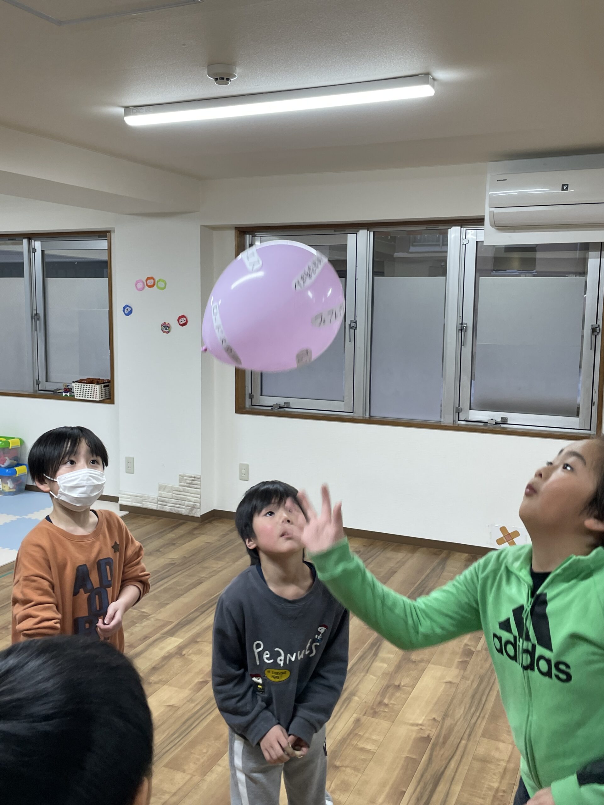 当てる役の子は、その周りで、風船に何の画像・文字が貼ってあるのかを、よーく見ていきました!