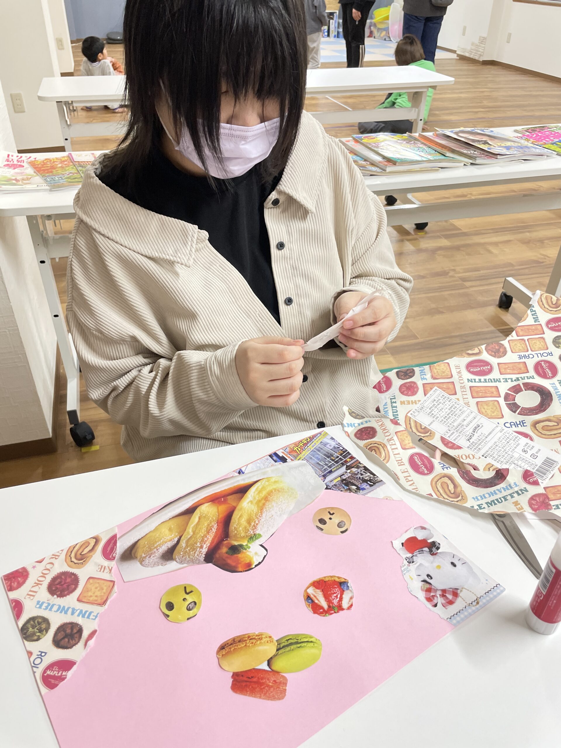 いろいろな雑誌・冊子から好きに切り抜いて、画用紙に貼っていきます。
