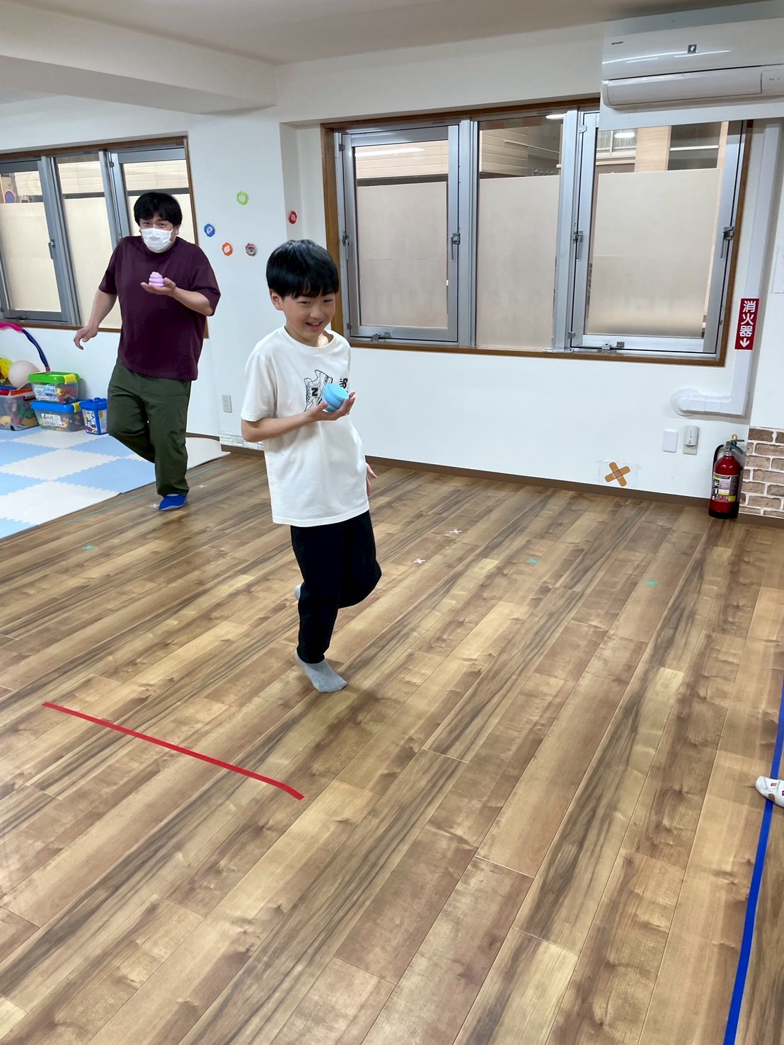 ケンケンパをしながら、ゴールまでお宝アイテムを運び、ケンケンパで戻ってきます。