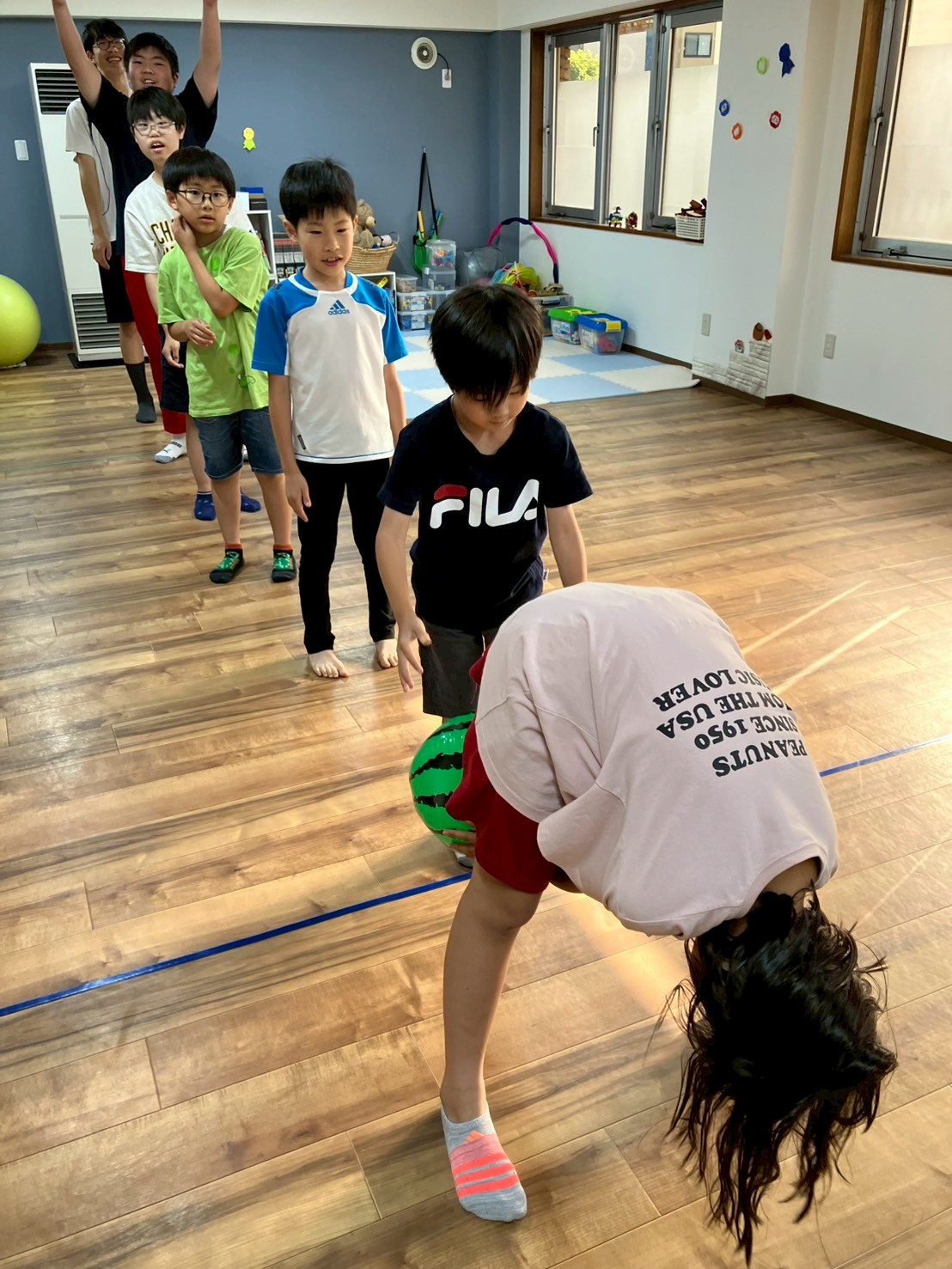 奇数で並んでいる子は、身体を後ろにそって、頭の上から後ろの子にボールを渡します。