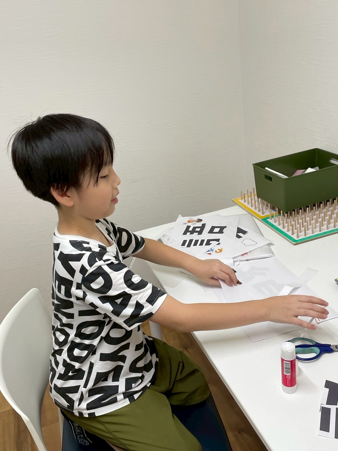 文字の練習は、漢字をハサミでパーツごとに切り取って、イラストのついている台紙に貼っていきました!
