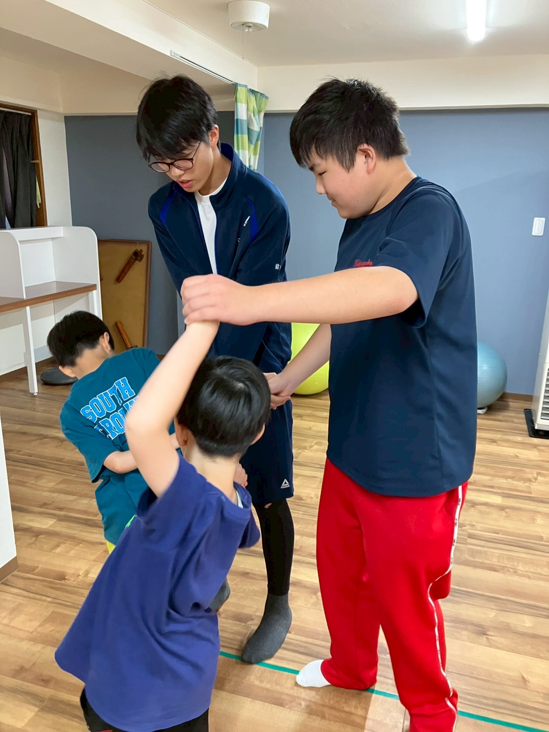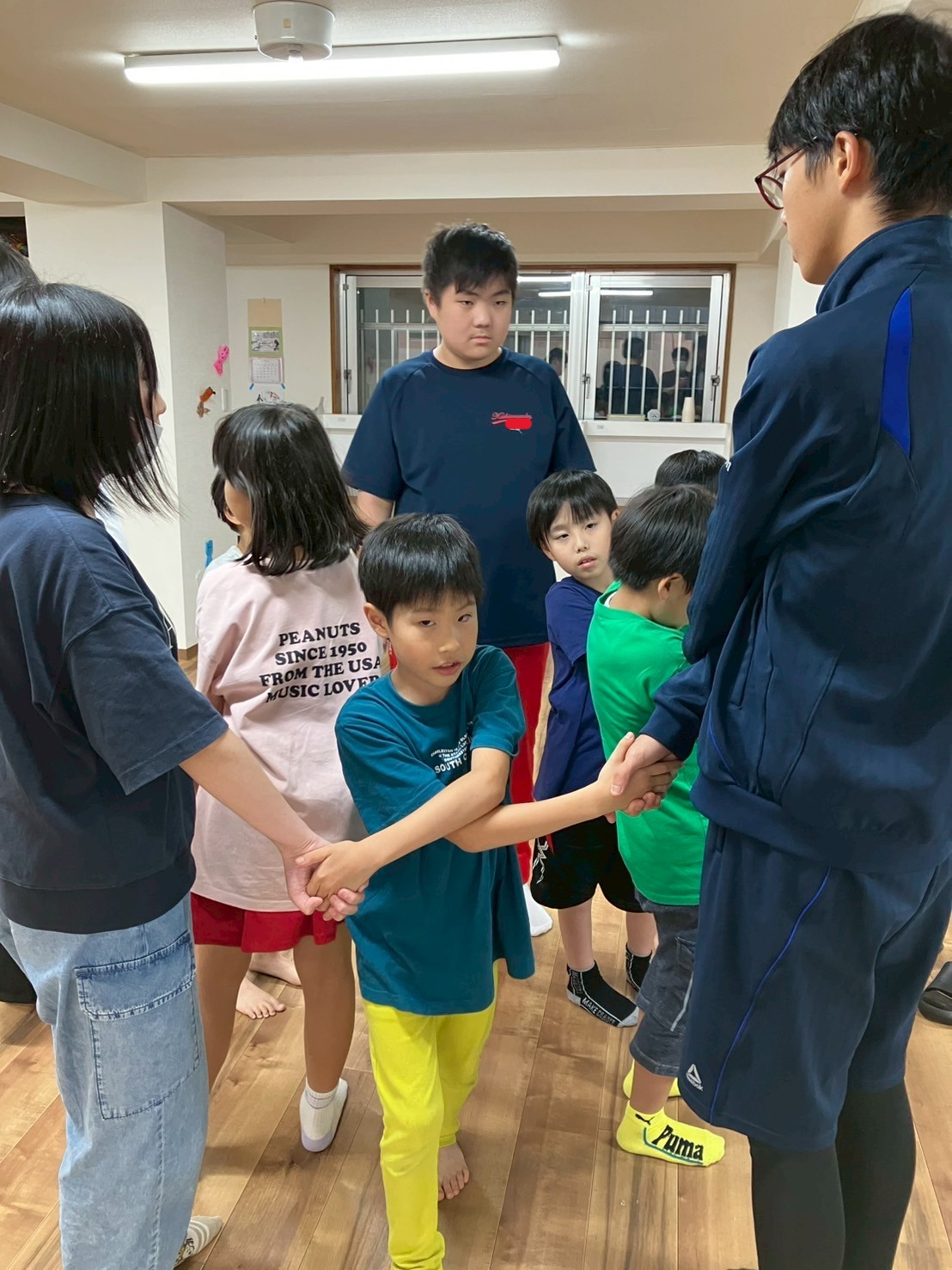 この日は、みんなで手を繋いで「人間知恵の輪」をやりました。