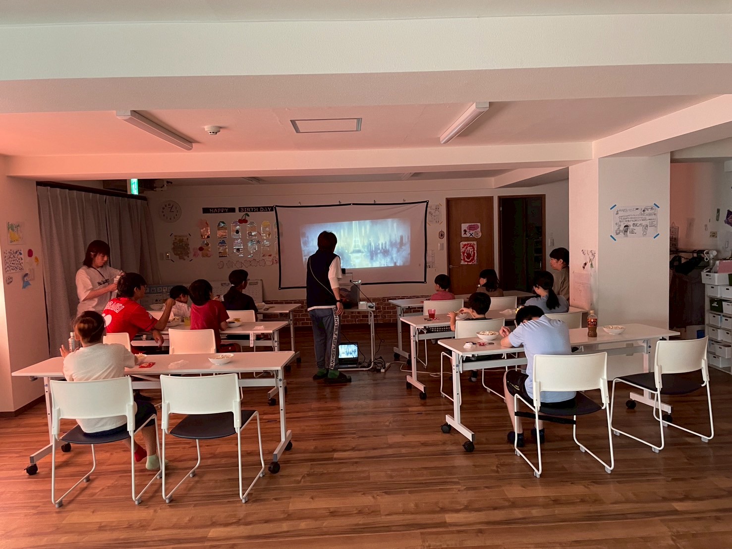 4日目の夏休み活動は、大きなスクリーンに映して、映画と言えばのポップコーンをおやつに