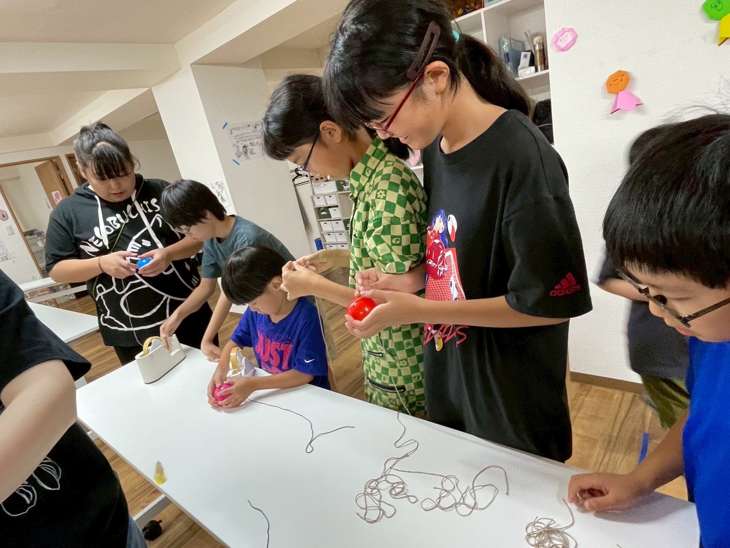 流れ作業で天井から飾るくす玉と、ヨーヨーのポスターを作りました!