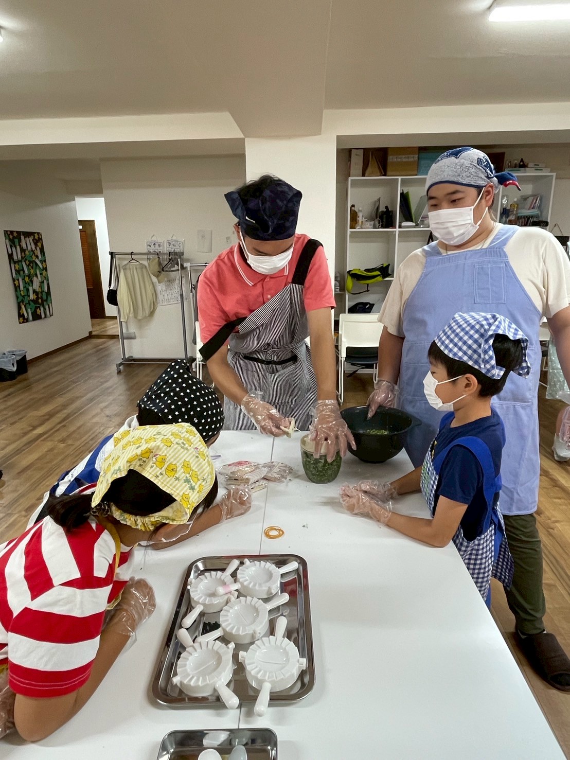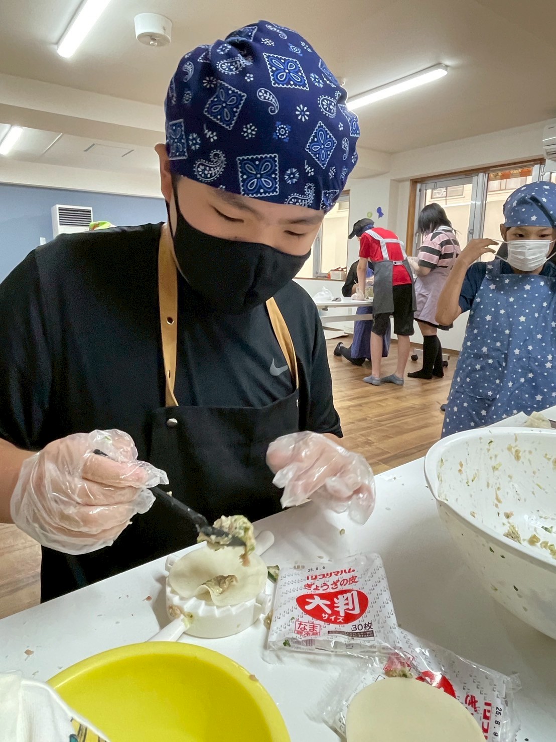 3グループに分かれて、ぎょうざの包み器も使いつつ、1グループ120個以上の餃子を包んでいきます!