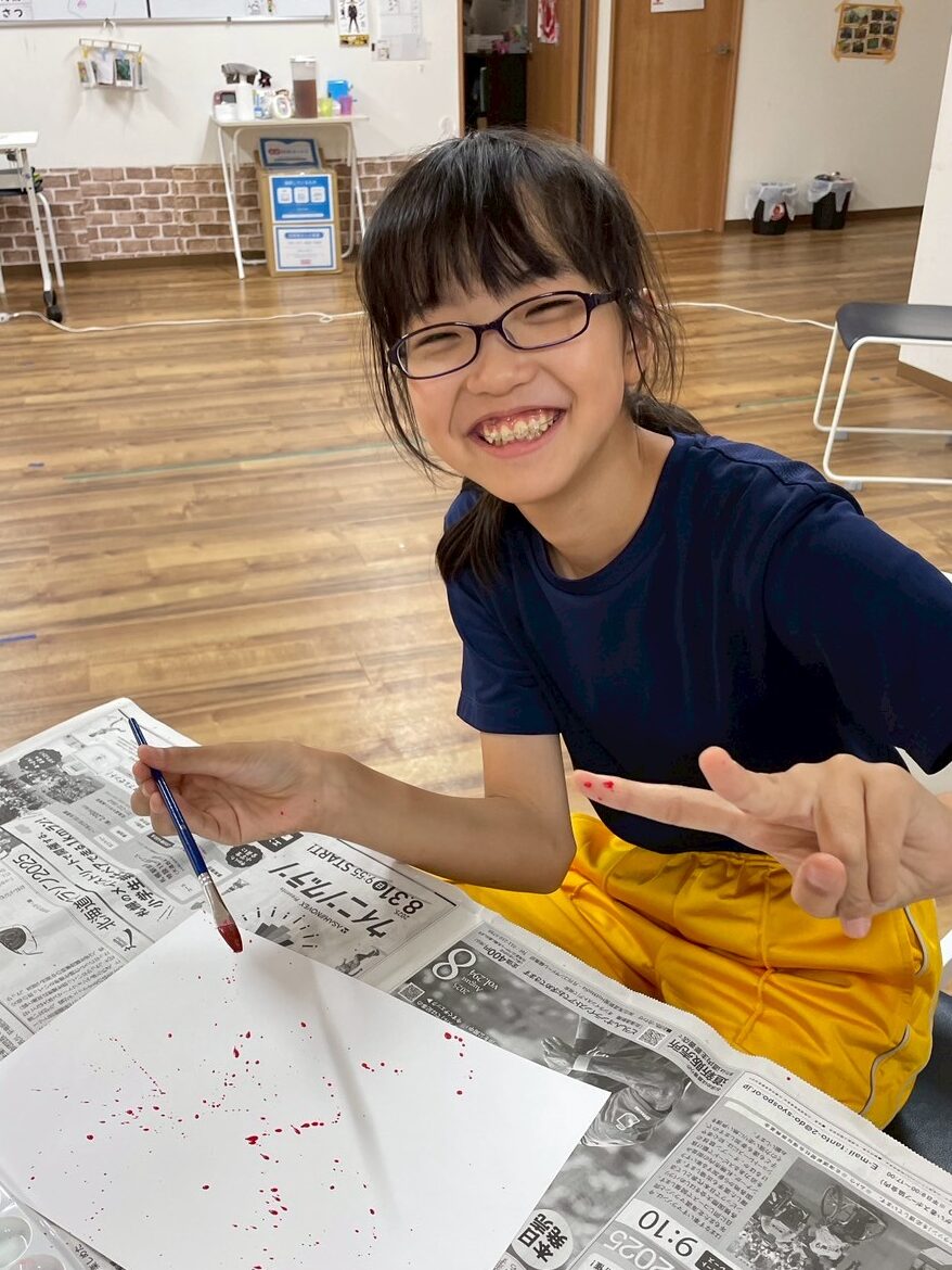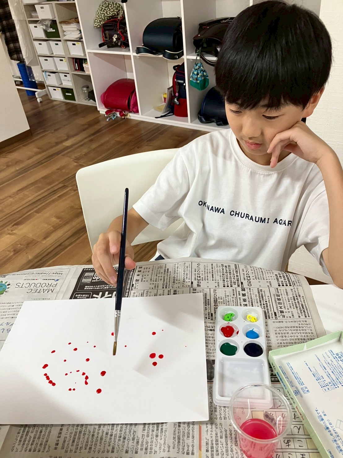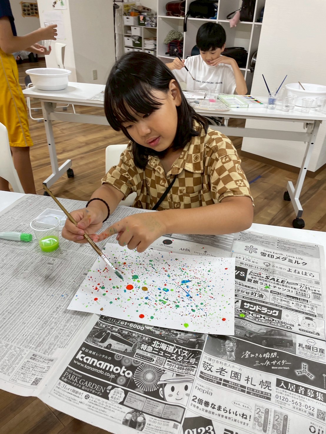 好きな色の絵の具を筆にしみ込ませて、上から垂らしてみたり、筆の持ち手を軽く叩いて絵の具を飛ばして作品を作っていきました!