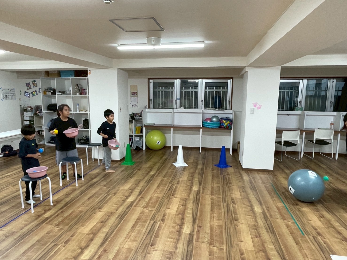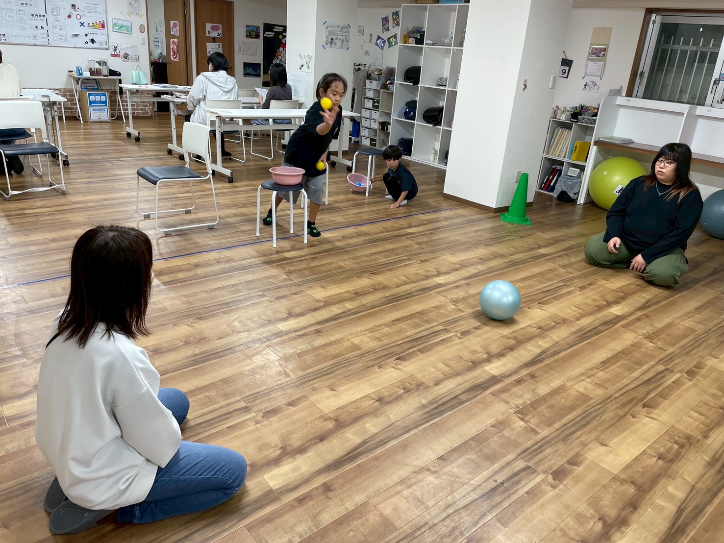 運動グループは、転がっているボールを狙って小さいボールを投げていきました!