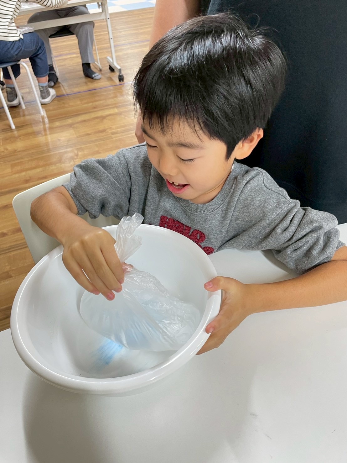 まずは普通の水を触ってもらい、その後は、袋と水を使ったアイテムを使いました!
