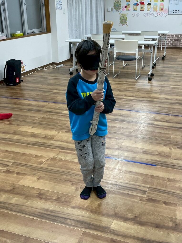 ルールはスイカ割りと同じで、目隠しをした子が新聞紙の棒を持ちその場でグルグル何度か周ります。