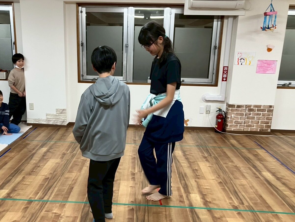 前後左右がわからなくなったら、周りの子達の「右~」「もっと前~」の声を頼りに