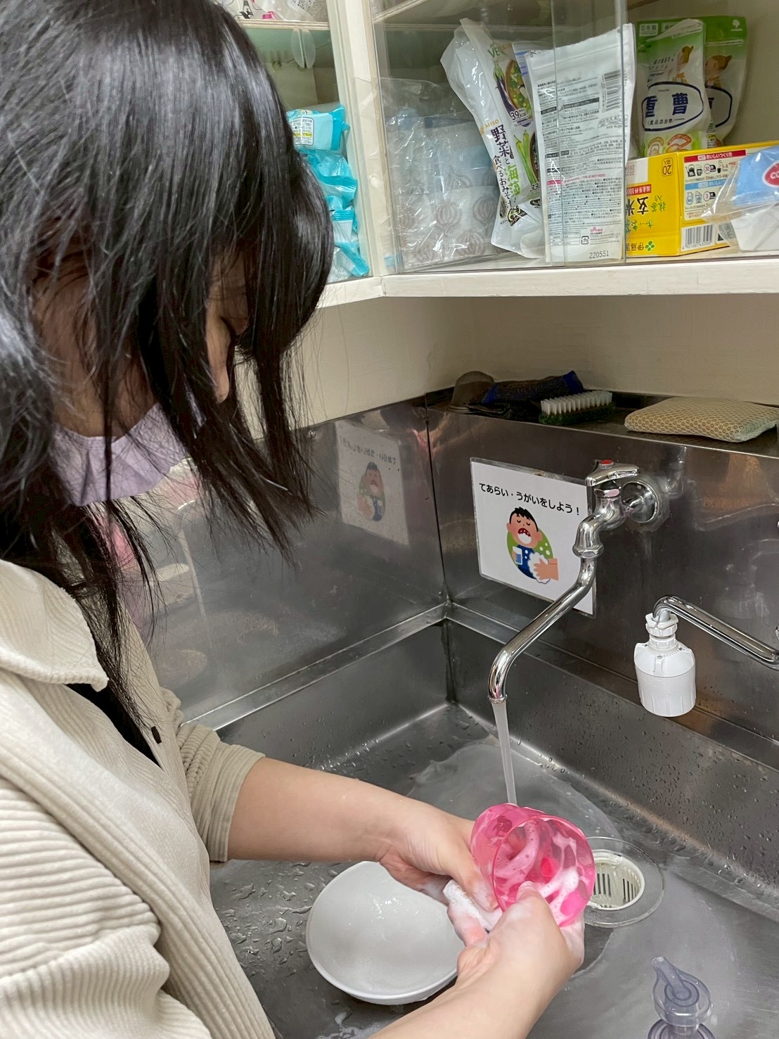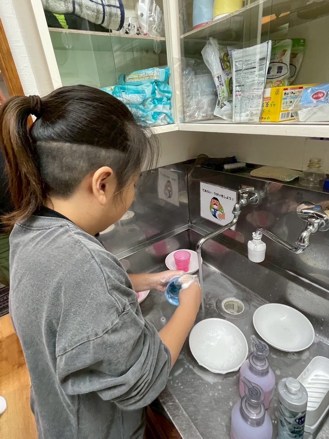 など、一つひとつ確認しながら体験し、洗い終わった食器は、しっかり拭いて水気をとり、食器棚にしまいました!