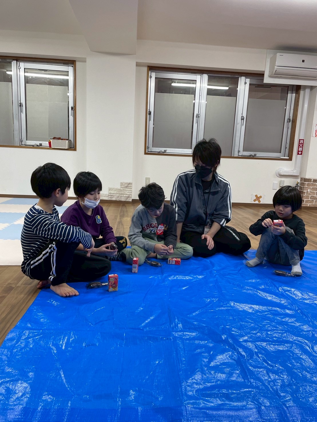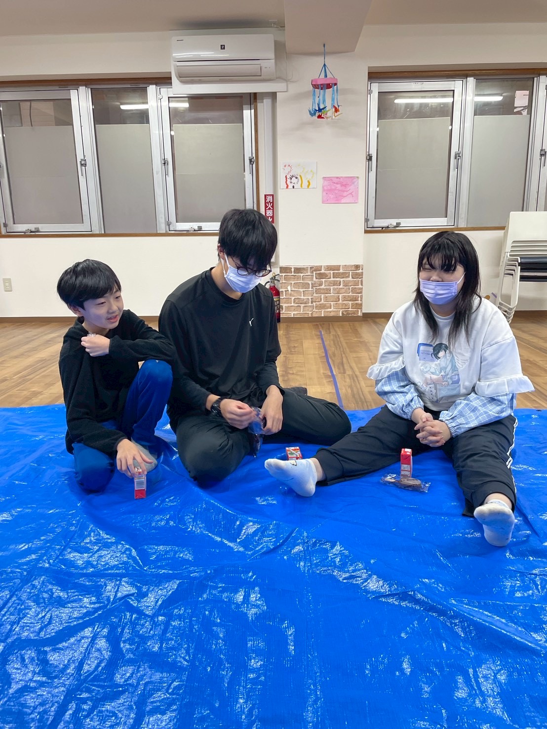 そして最後に、大きなブルーシートを広げて、今年一年、学校も勉強も遊びも全部、お疲れ様—–!ということで、忘年会をしています。