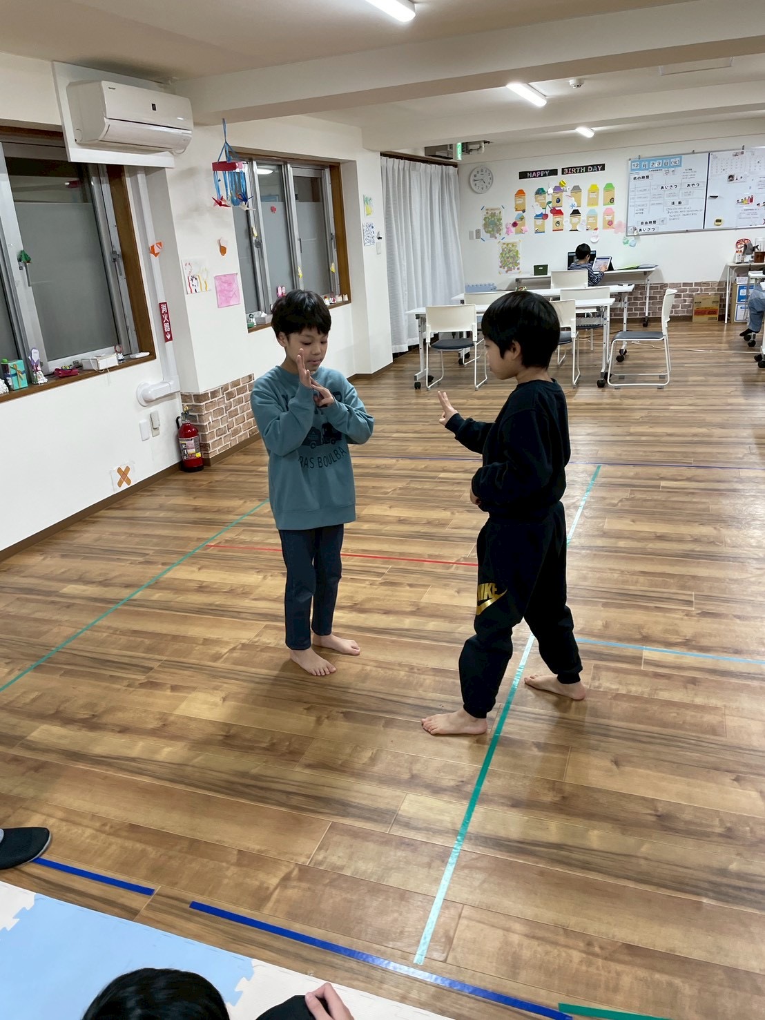 声を出すのはNG。体や指などの動きだけで、誕生日順に並んでいきました!