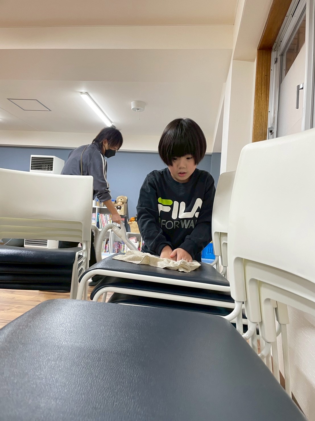 みんなで片付けをしてからテーブルをよけて、椅子や机を拭いたり、広い室内も雑巾がけしています!