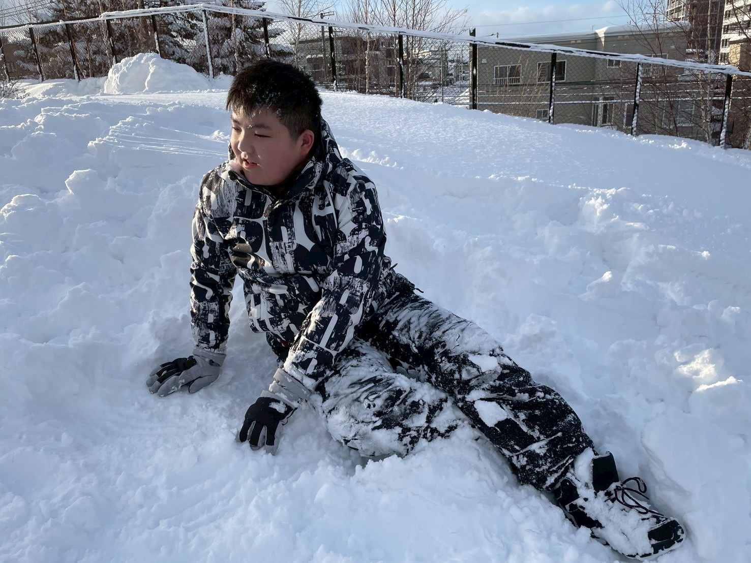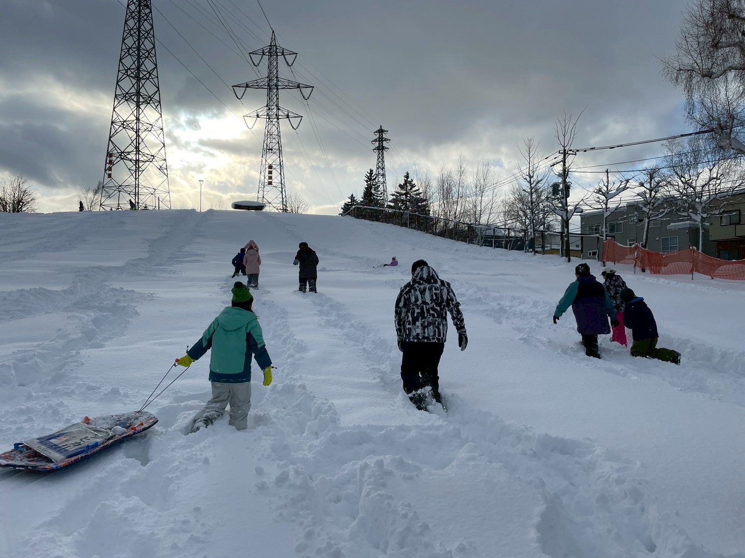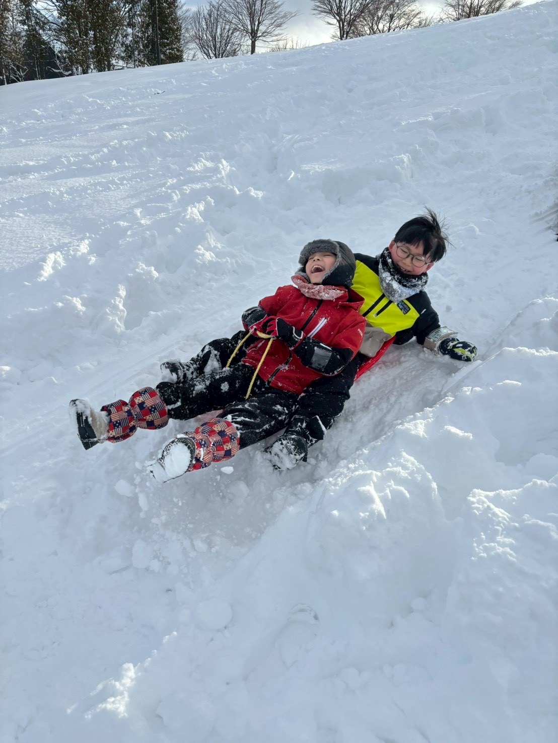 雪が深くてすぐには滑れなかったので、まずは踏み固めてからそりで滑っています!