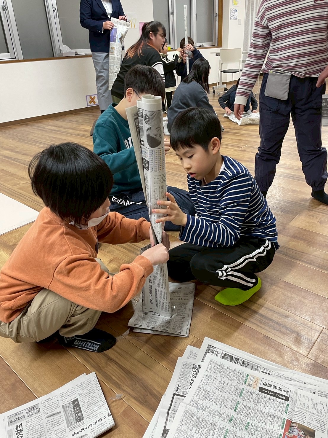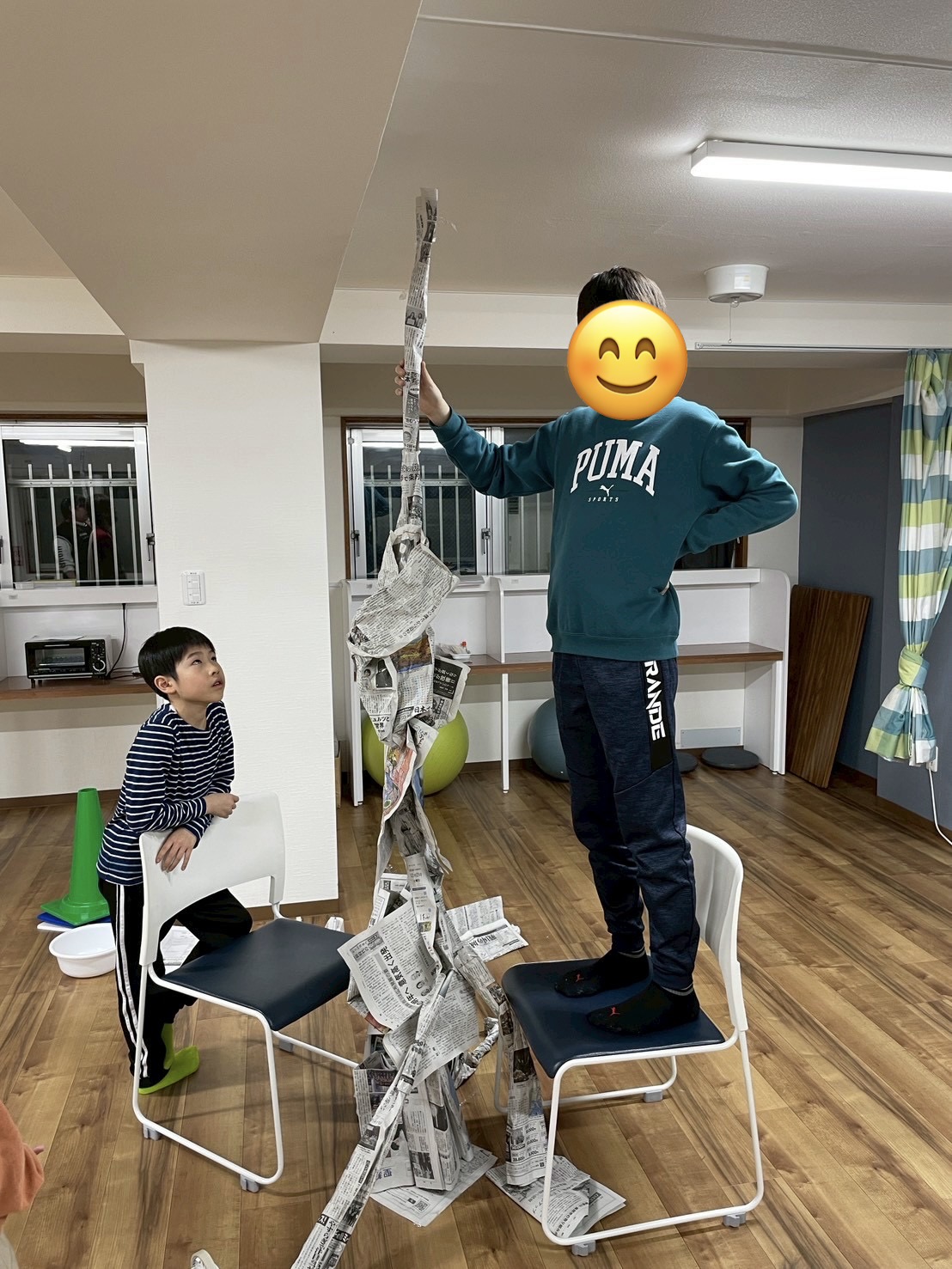 2チームにわかれ、新聞紙を折っても丸めてもOKなので、とにかく高く積み上げます(テープやノリは禁止🚫です)