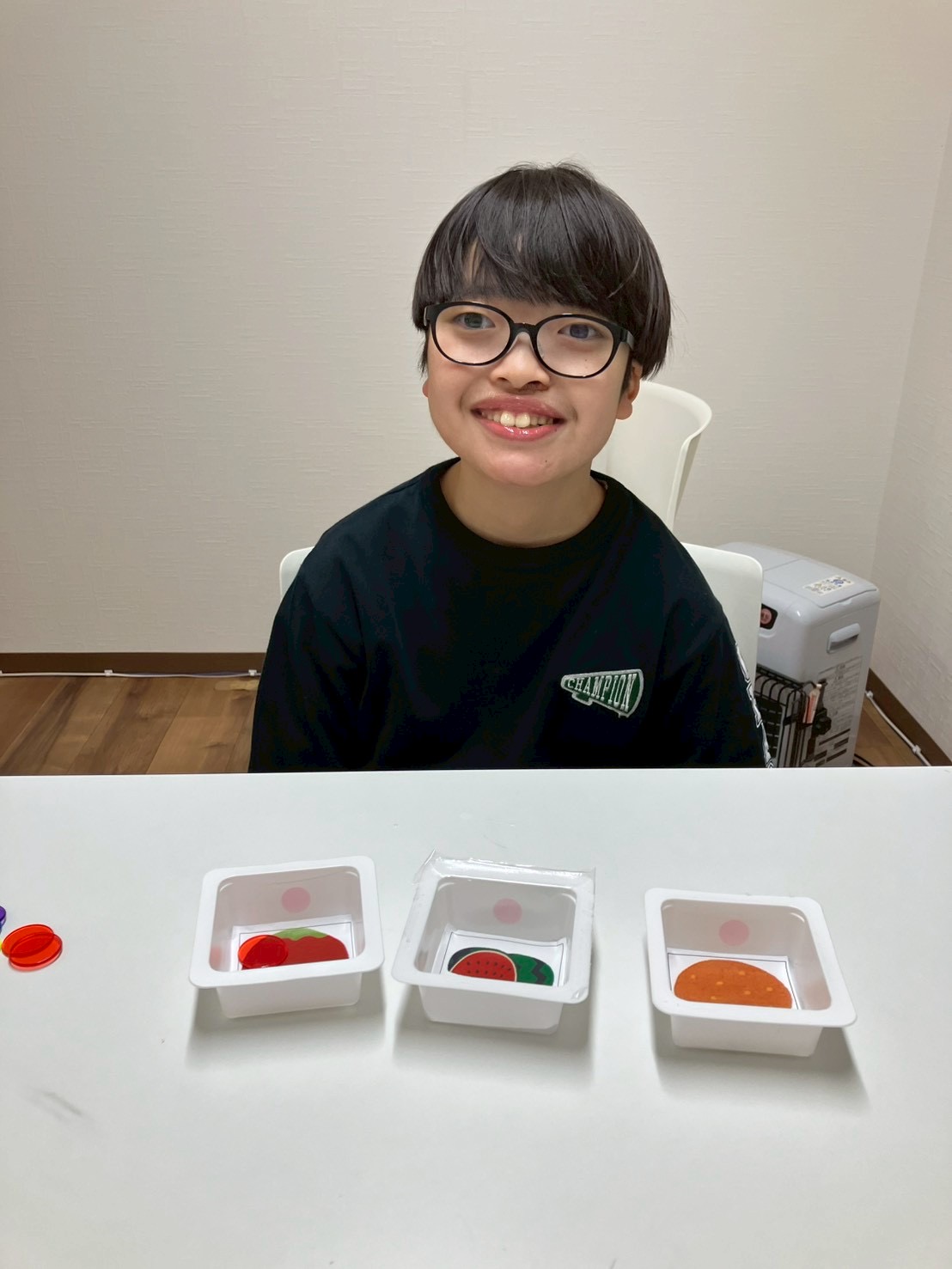 マッチング練習では、職員が指定したイラストがついている箱の中におはじきを入れたり、