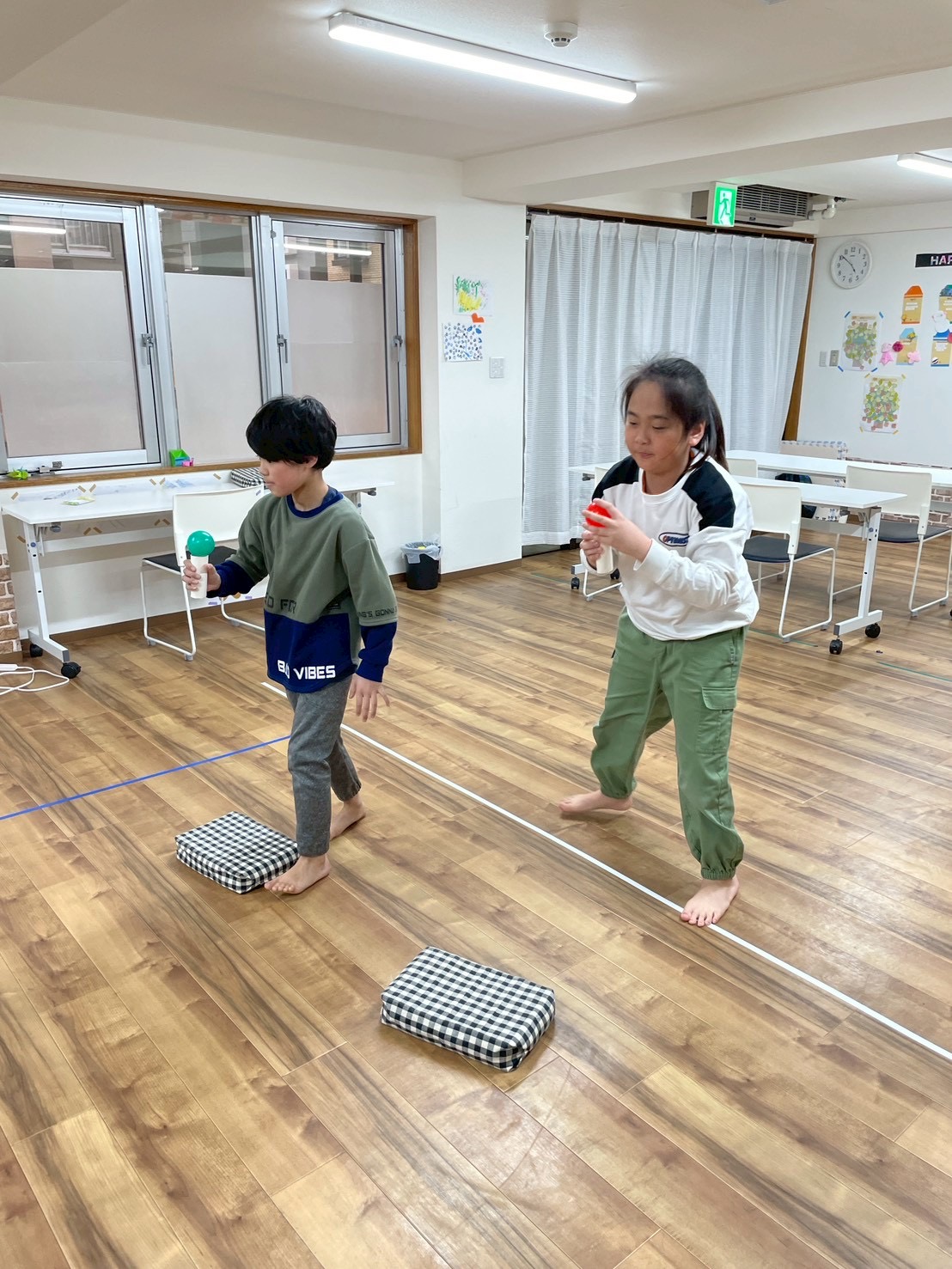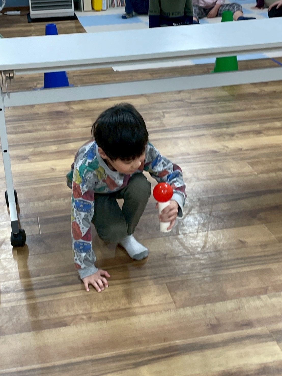 1週目はトイレットペーパーの芯にカラーボールを乗せて、落とさないように障害物をクリアしながら進んで行きます。