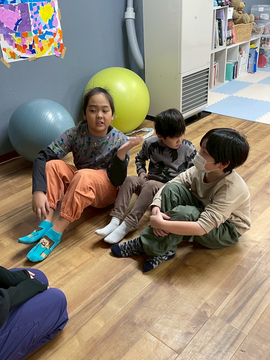 ストレッチなど、準備体操をしっかりしてから、近くの子と二人組になってもらいました。