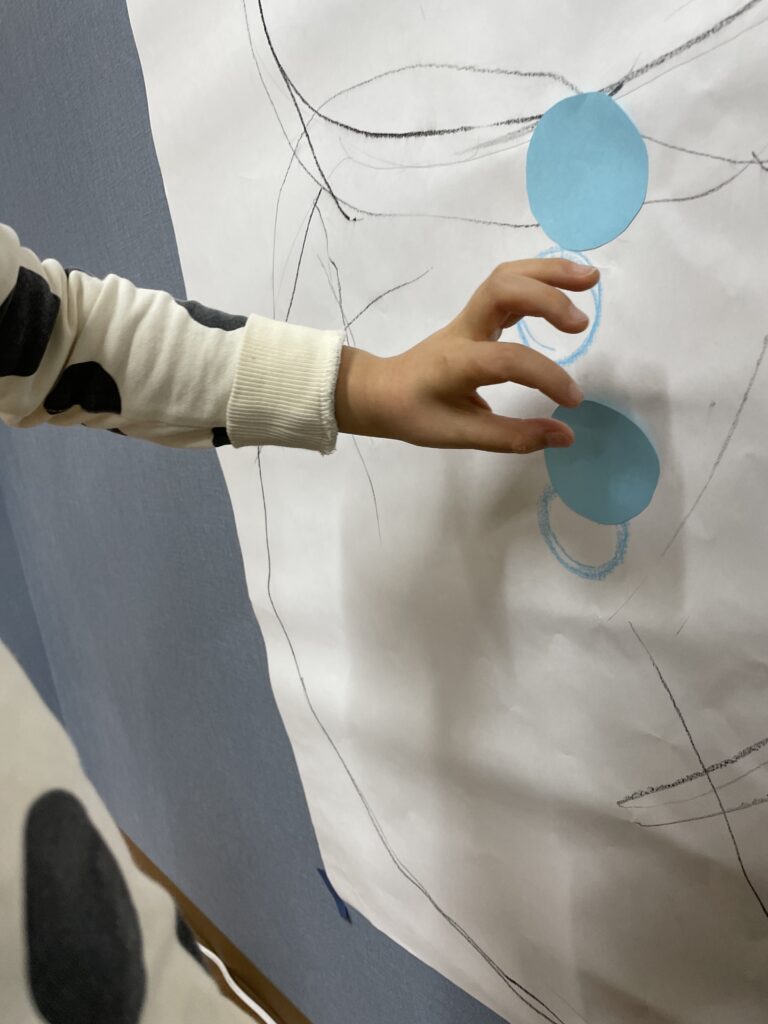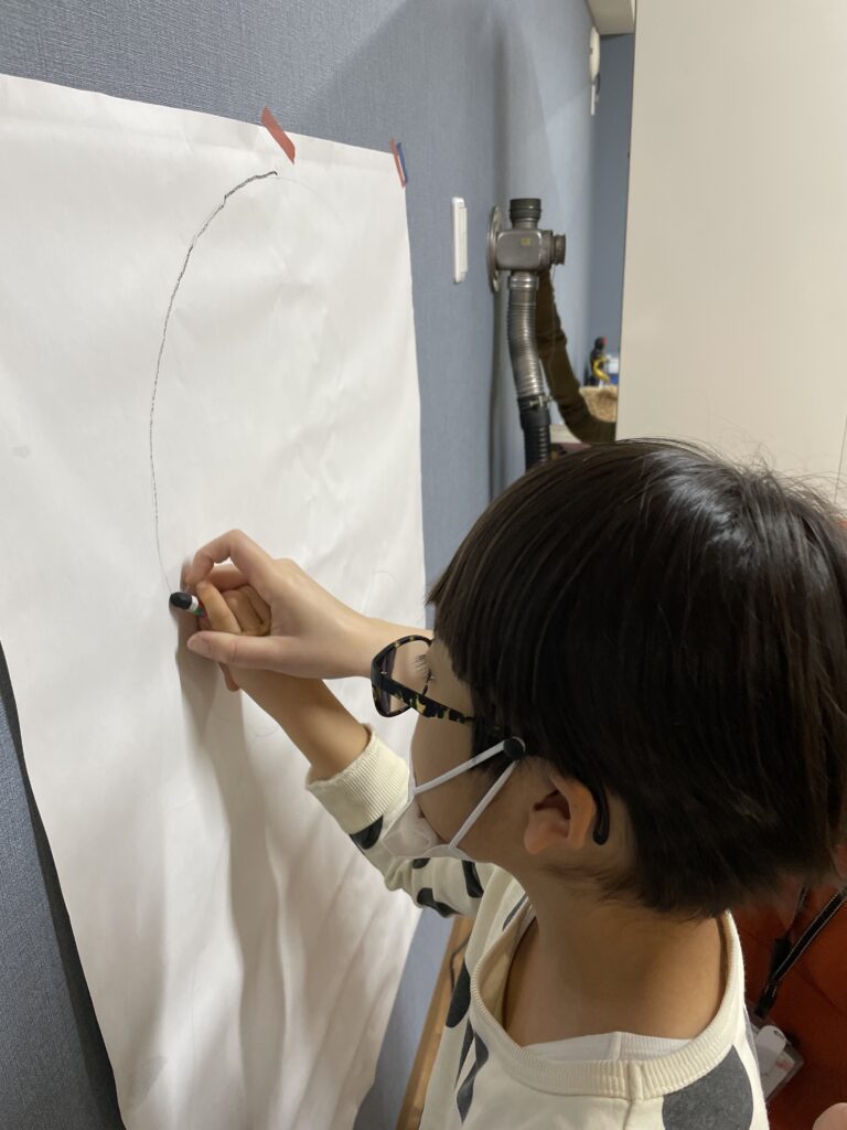 壁に模造紙を貼り、クレヨンで2つの丸を大きく描きます。