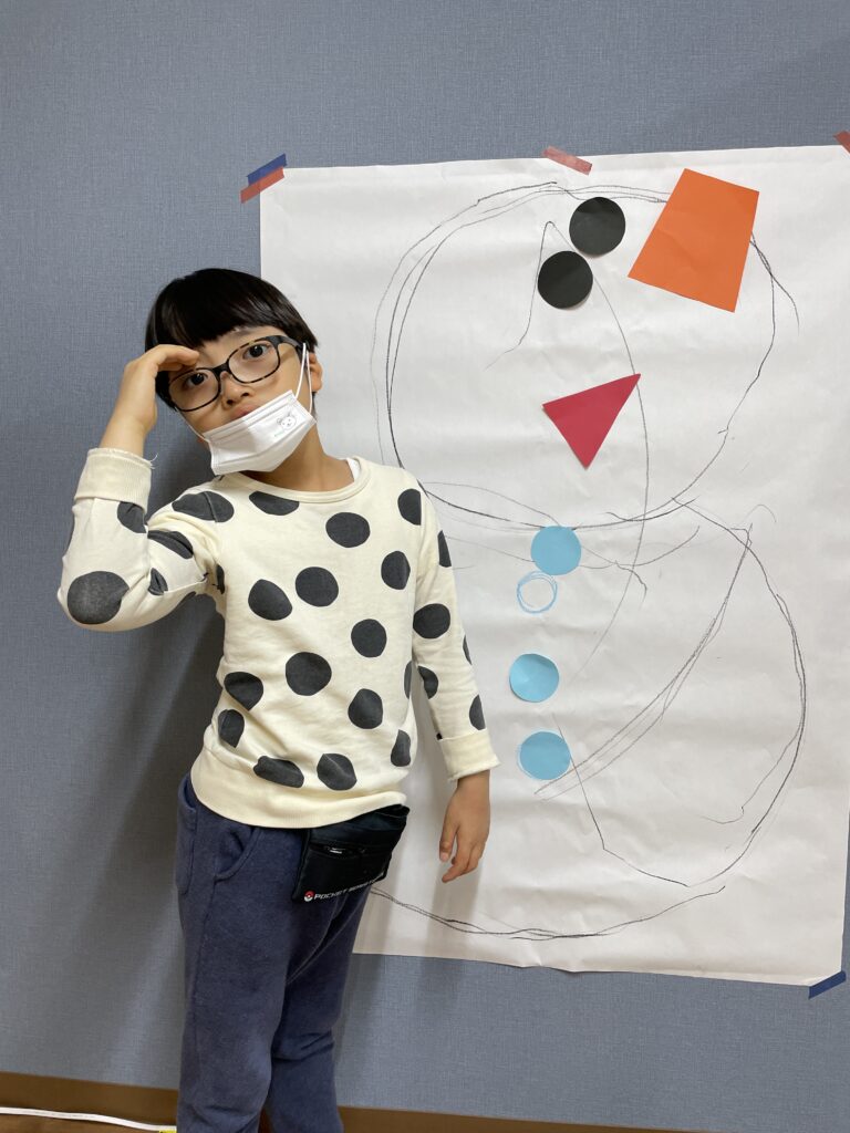 そして、雪だるまの周りに、指に絵の具をつけて雪を降らせていきました。