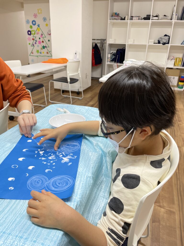 そのあとは、フィンガーペイントで雪の絵を描きました。