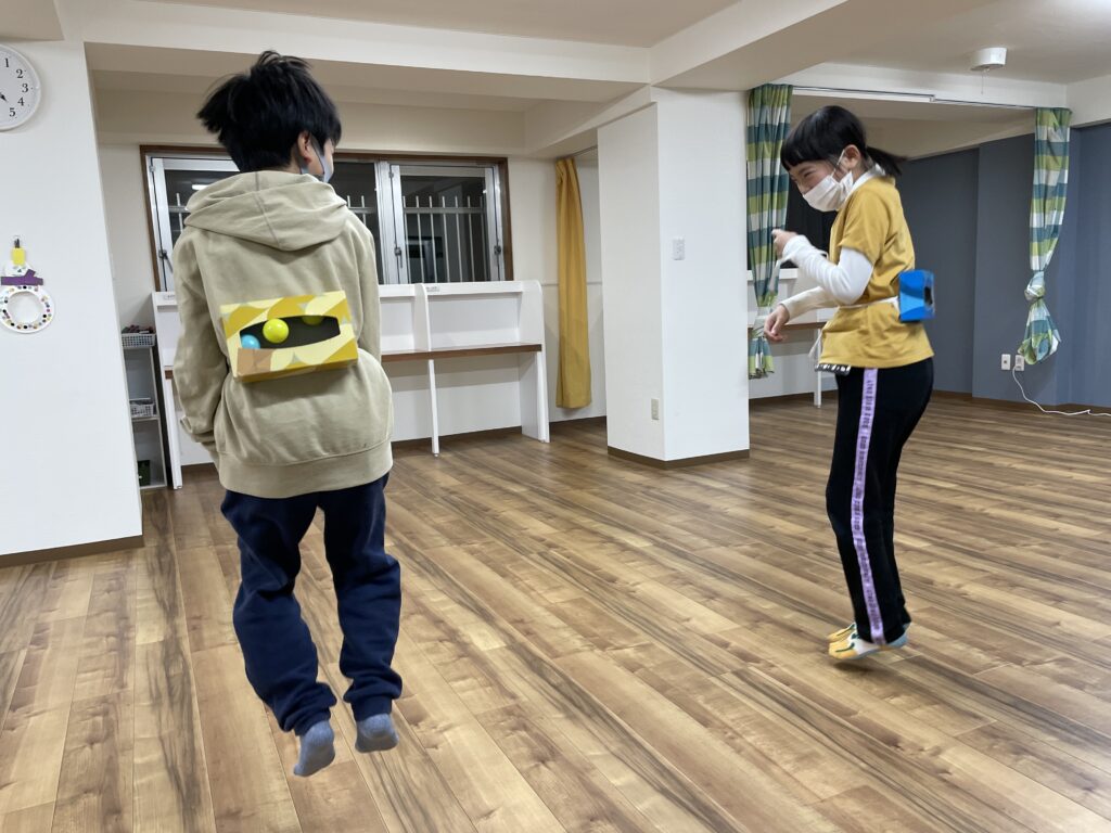 洗濯ばさみを指でつまんで物を挟むという運動と、つまんで取るという2つの運動のあるゲームでした!